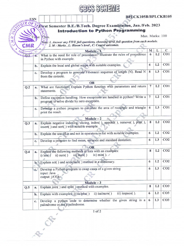 Python JAN sem paper - BPLCK105B - VTU first sem/second sem - Studocu