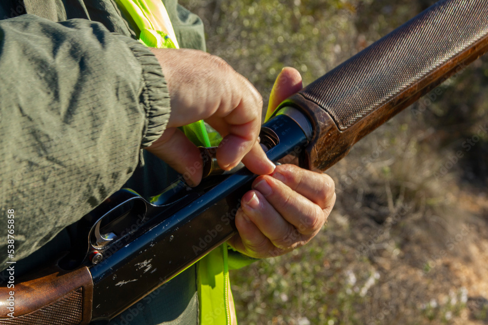 Foto de Cazador cargando escopeta de caza con munición en la montaña do ...