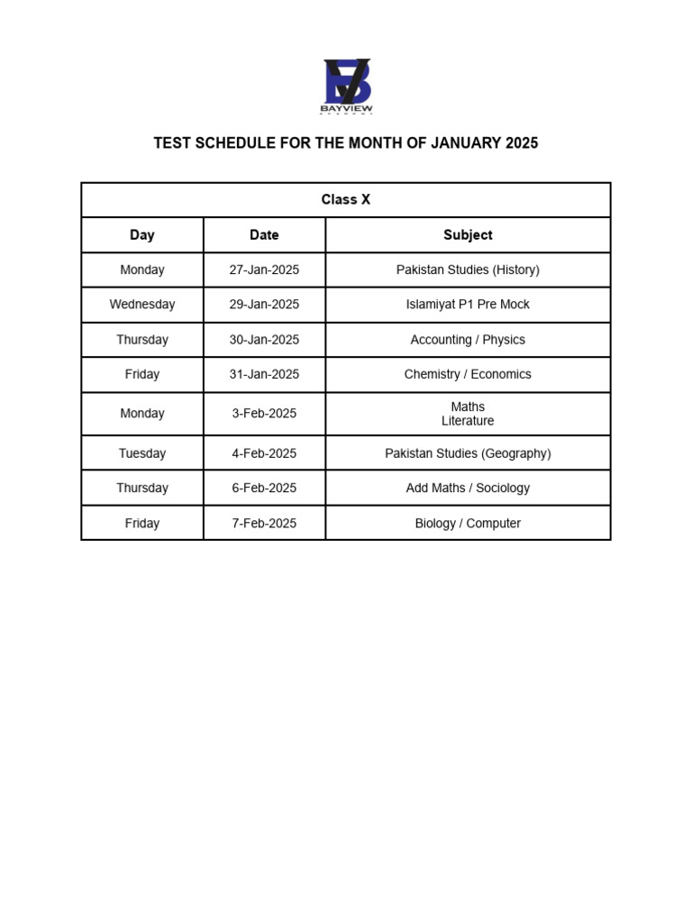 Test Schedule For The Month of January 2025 - Class 10 | PDF