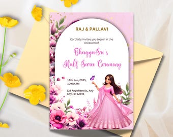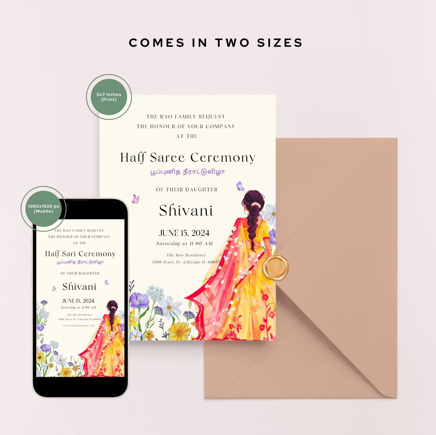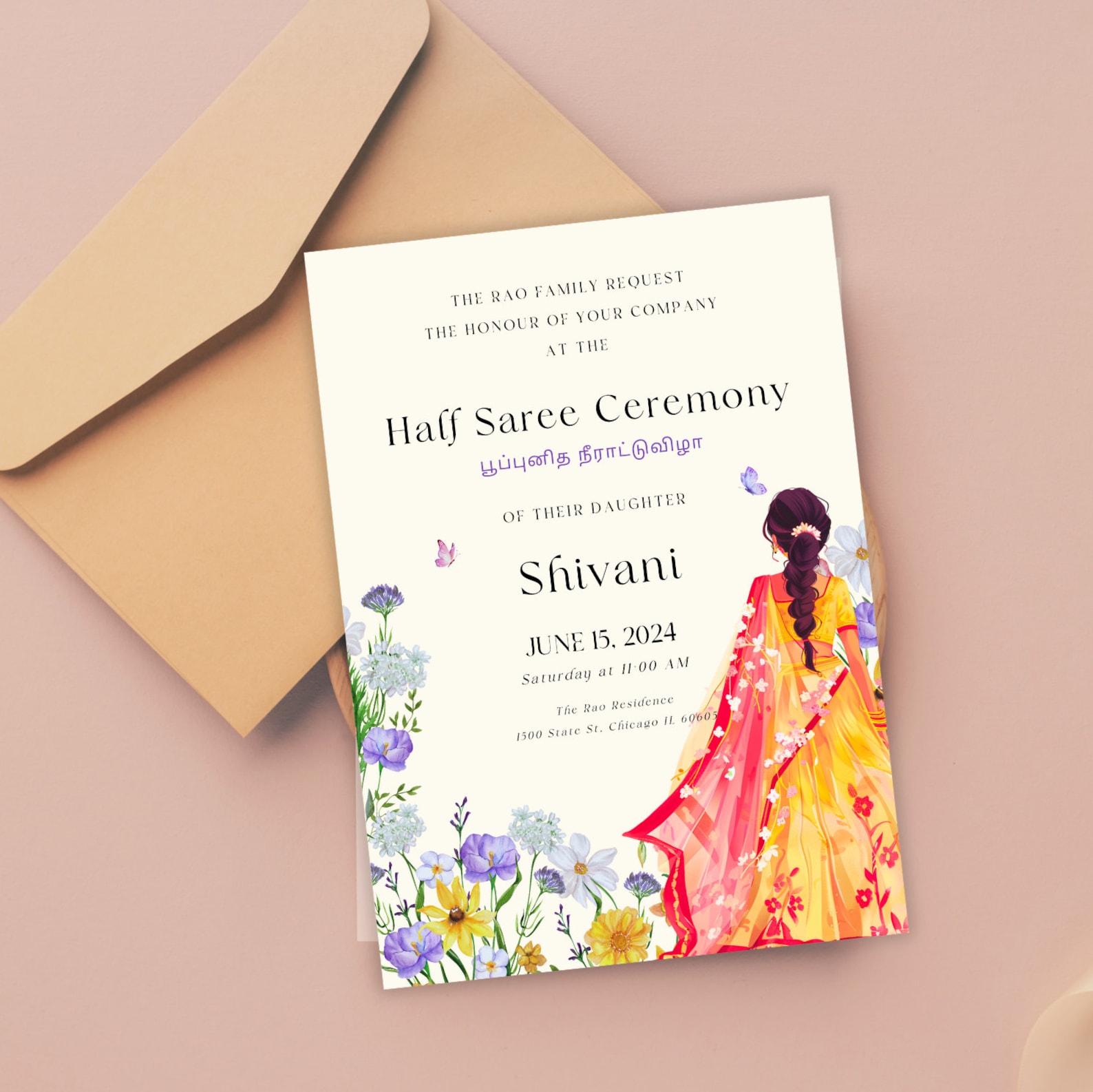 Half Saree Invitation 5x7, Editable Half Saree Ceremony Invitation ...