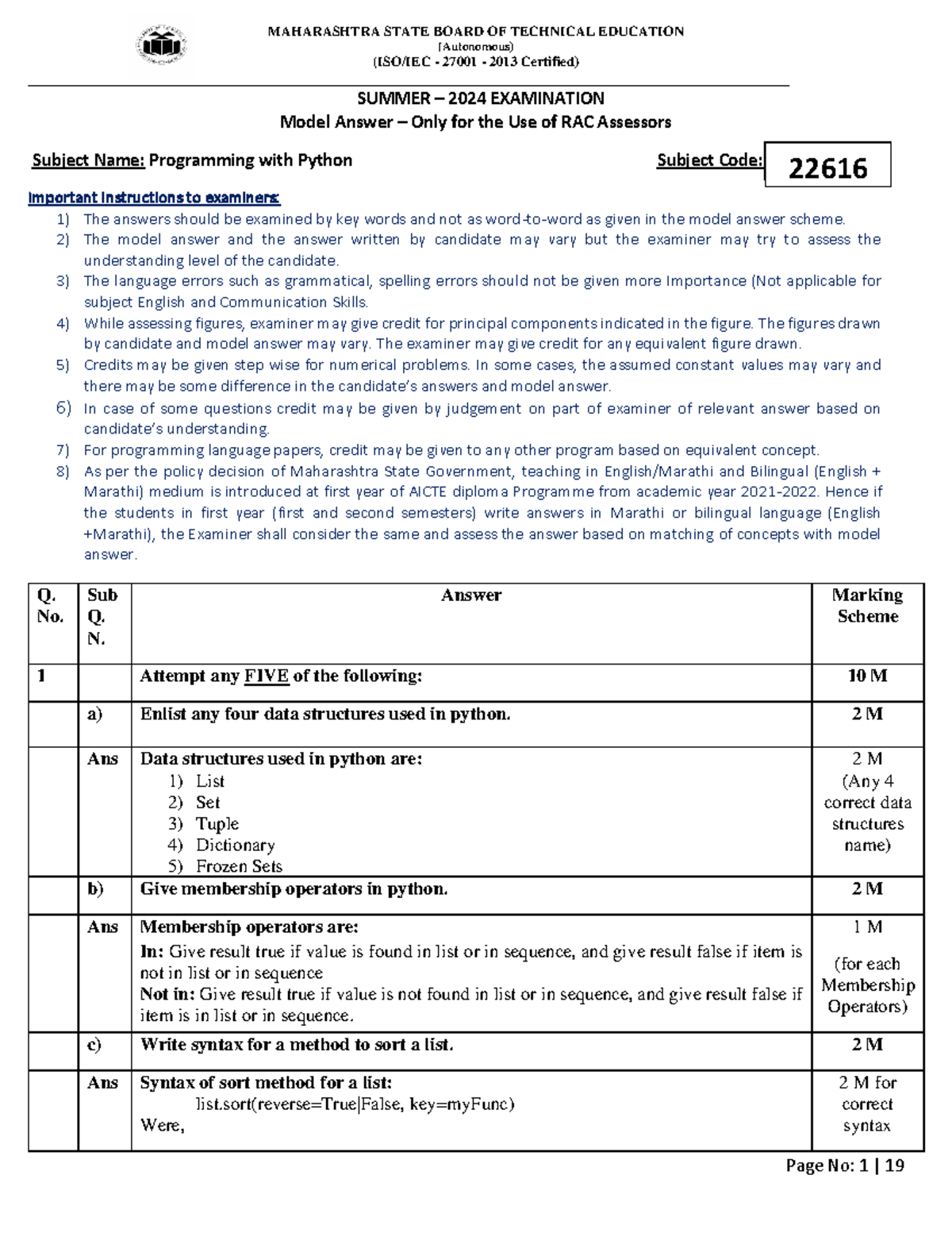 Model Answer for Programming with Python (Subject Code: S-24) - Studocu
