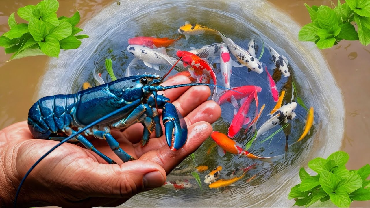 Catch Lobster Shrimp And Colorful Ornamental Fish In Small Pond, Koi ...