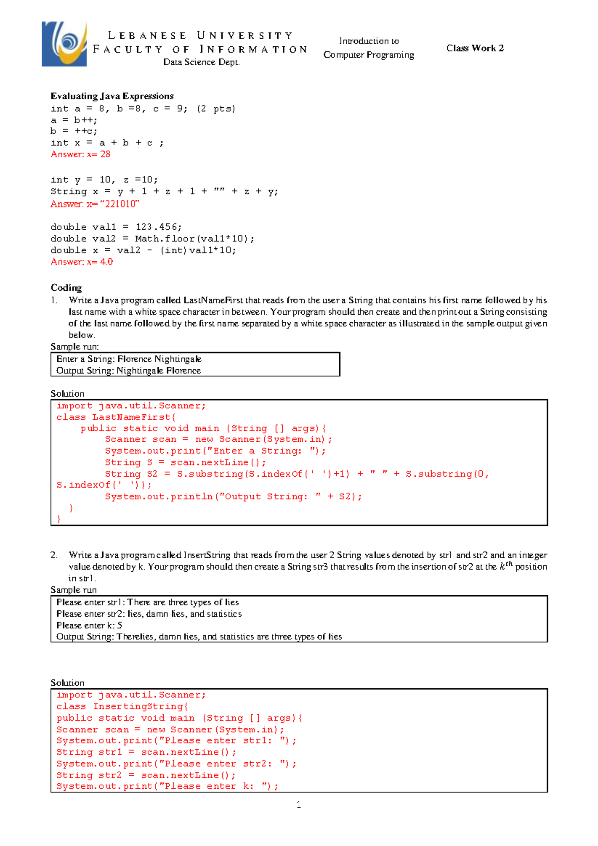 CS101 - Class Work 2: Java Expressions & Programming Solutions - Studocu