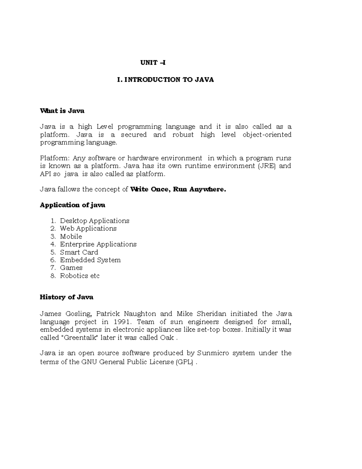 java unit 1 notes - UNIT – I I. INTRODUCTION TO JAVA What is Java Java ...