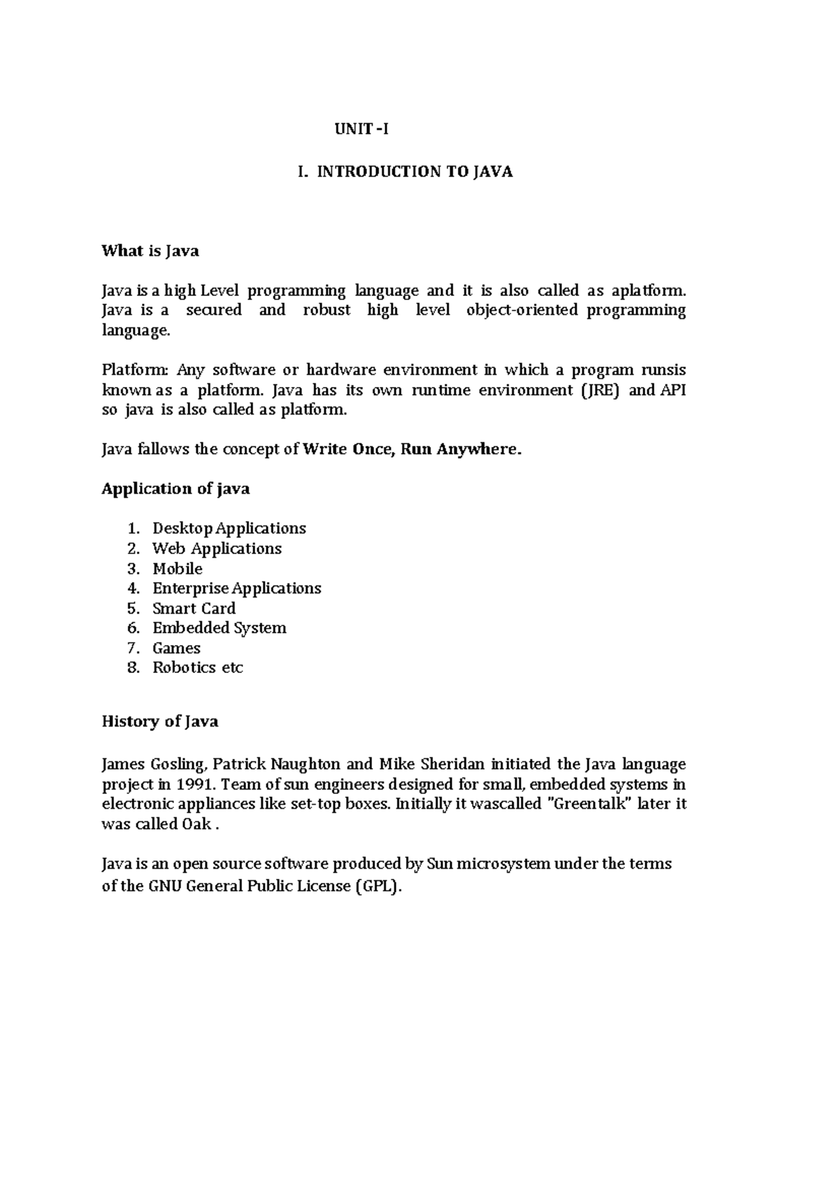 OOP- Notes-final - Notes - UNIT – I I. INTRODUCTION TO JAVA What is ...