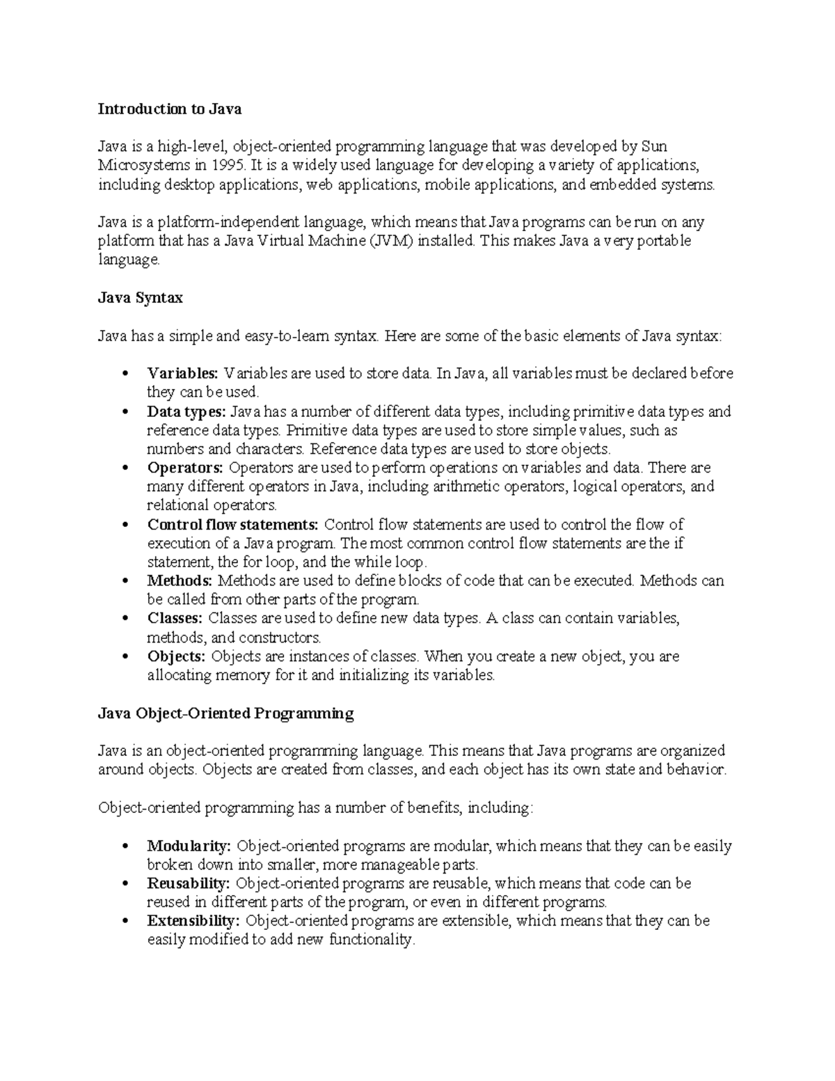 Introduction to JAVA - Notes - Introduction to Java Java is a high ...