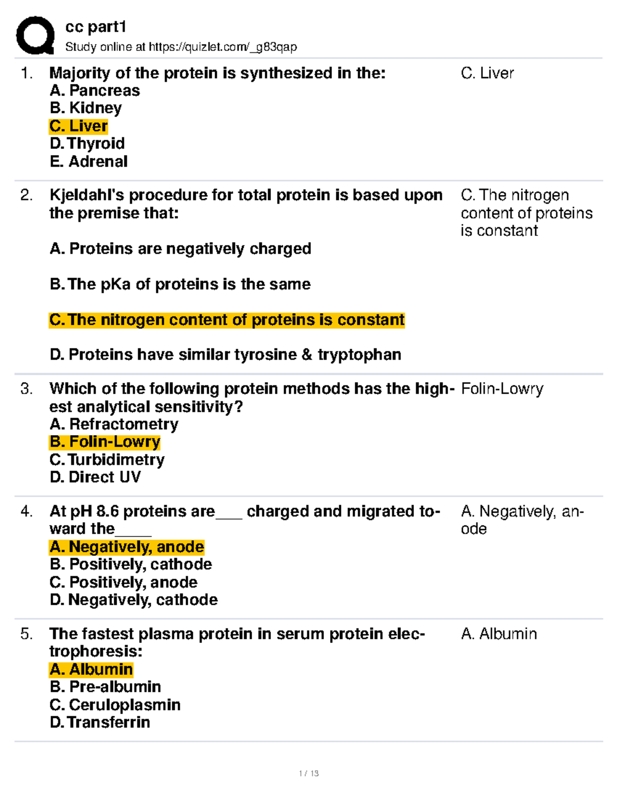 CC Long Quiz: Protein Synthesis, Electrophoresis & Renal Function - Studocu