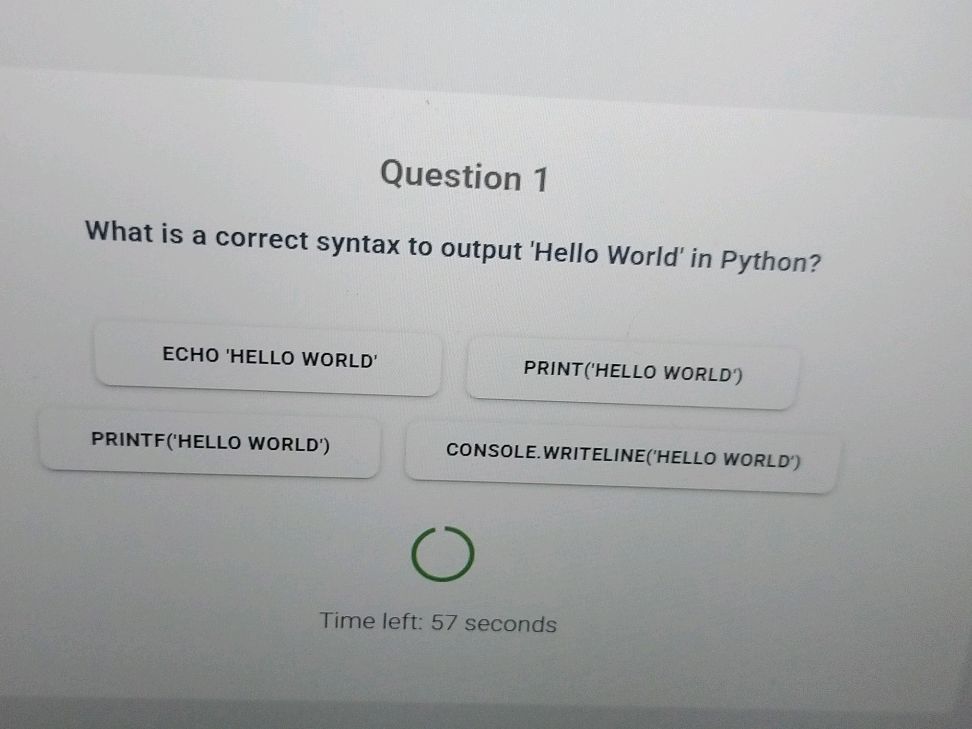 Solved: What is a correct syntax to output "Hello World" in Python? a p ...