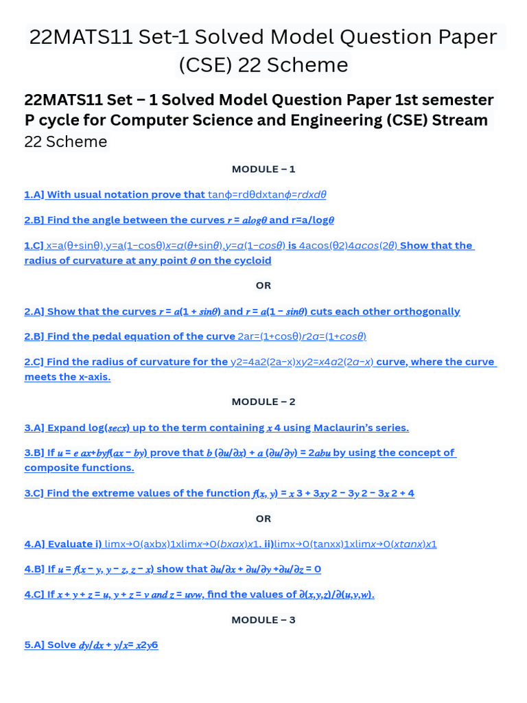 22MATS11 Set-1 Solved Model Question Paper (CSE) 22 Scheme | PDF ...