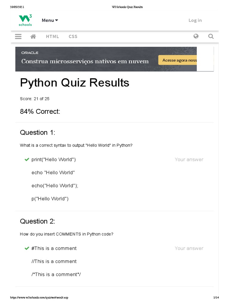 W3Schools Quiz Results - Python | PDF | Computer Science | Software ...
