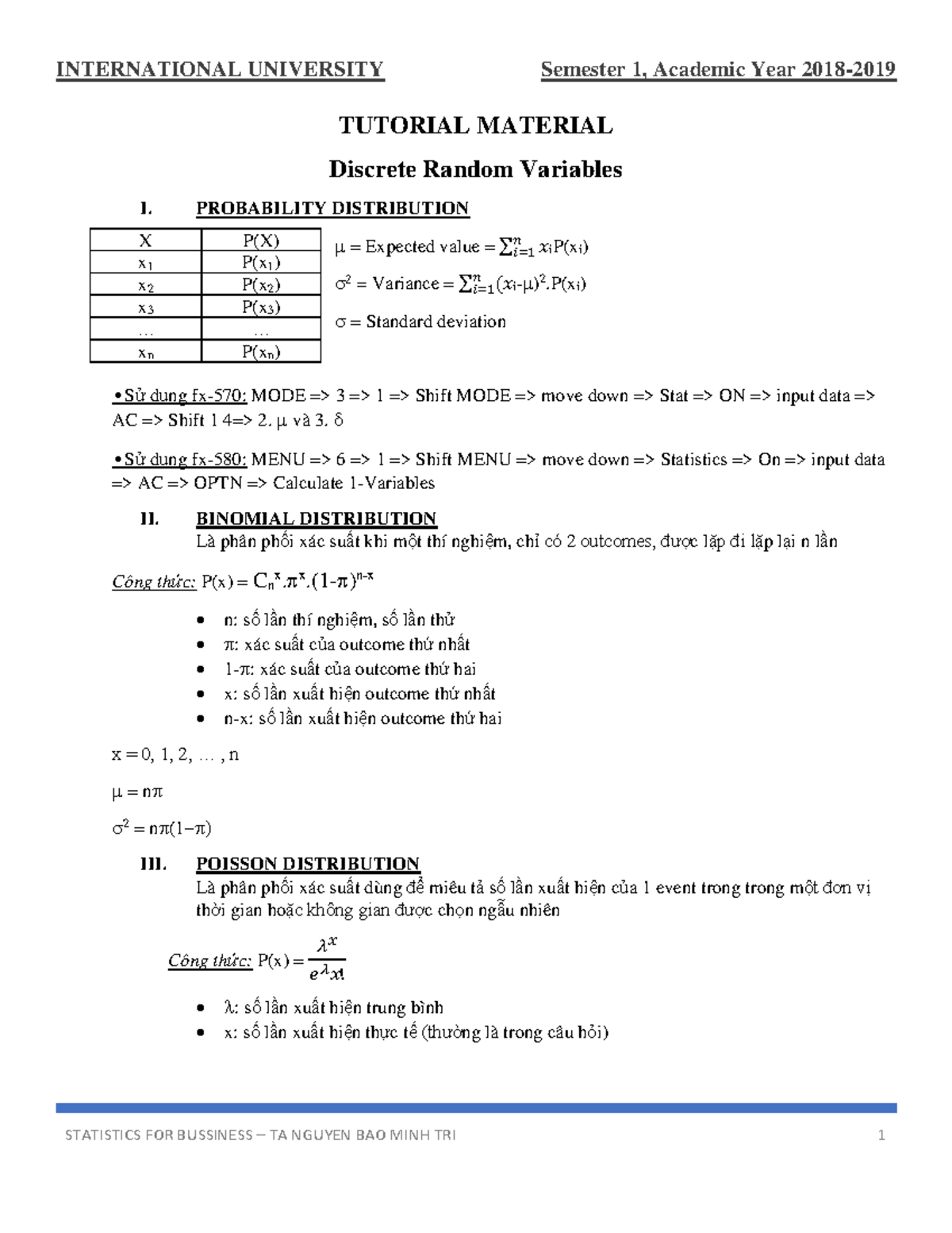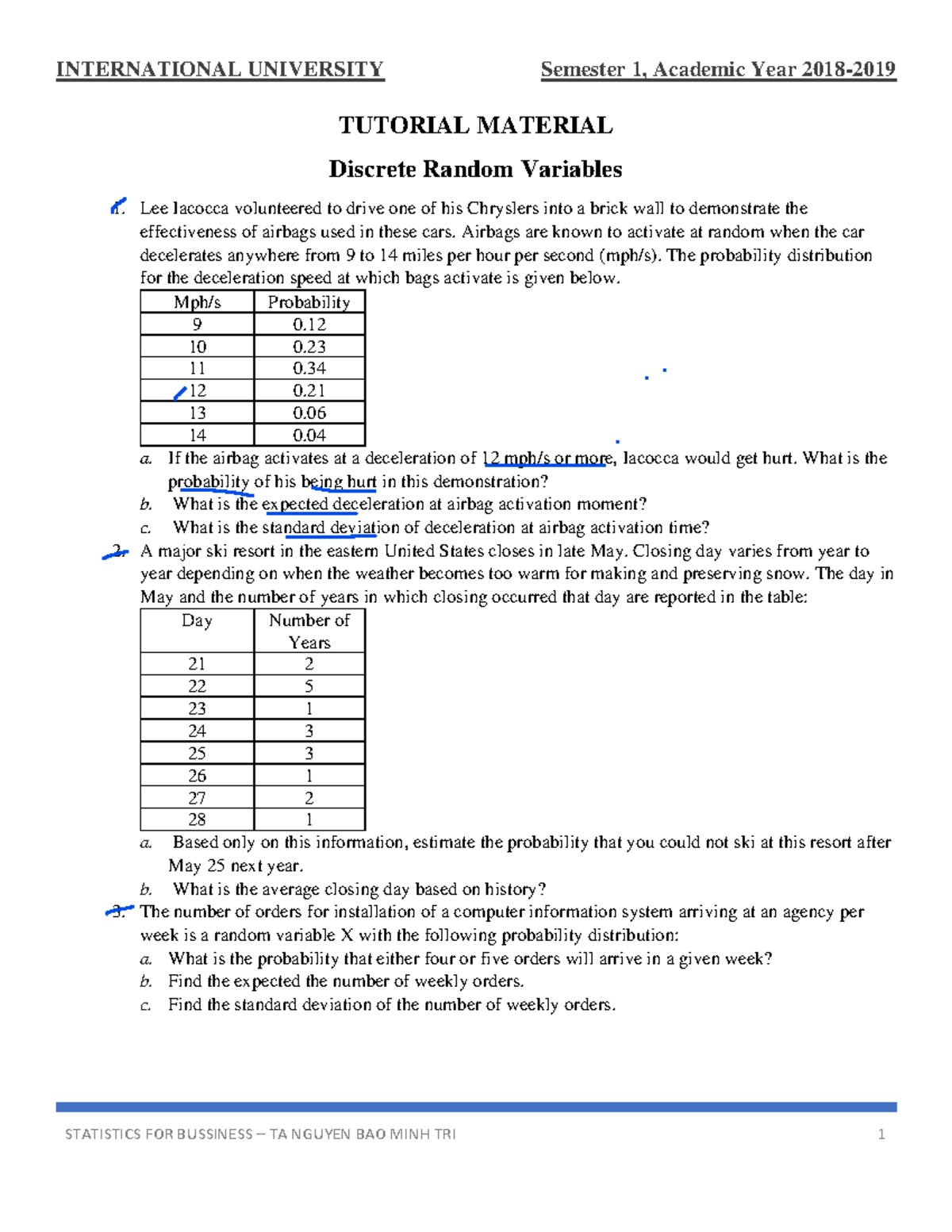 STATISTICS FOR BUSINESS TA 1: Discrete Random Variables & Distributions ...
