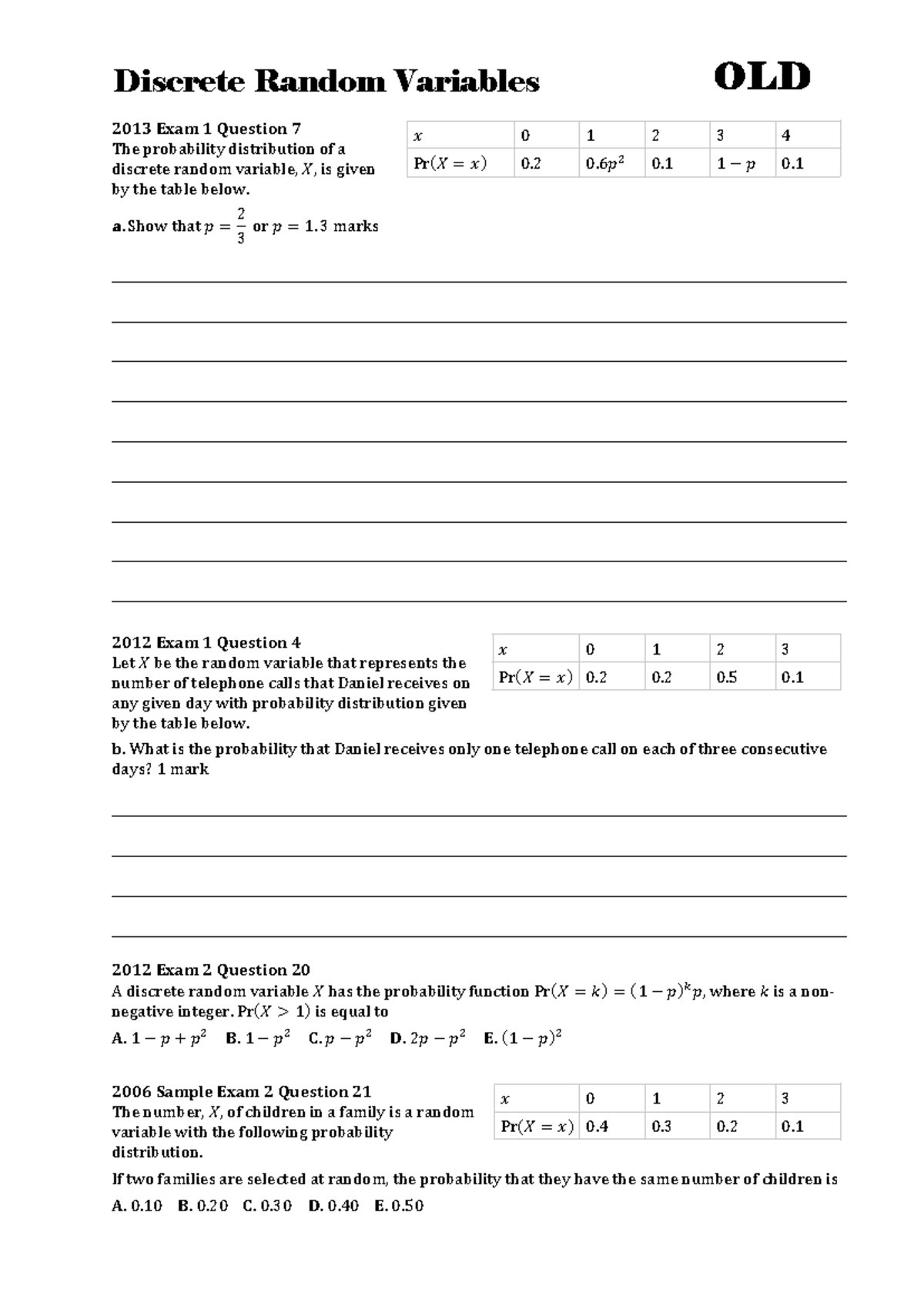 Probability Distribution of Discrete Random Variables - 2013 Exam - Studocu