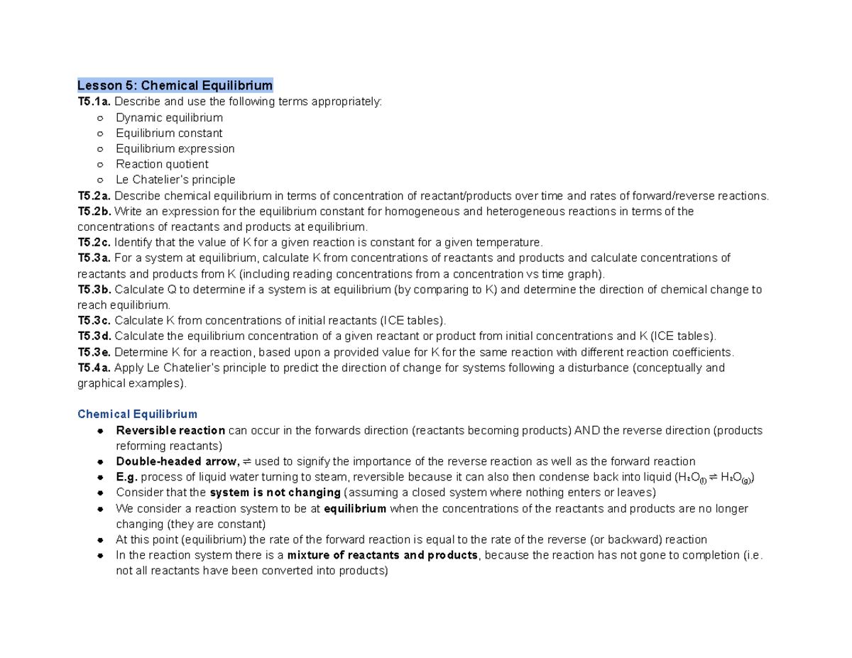 CHEM1011 Threshold Notes wk 5-9 - Lesson 5: Chemical Equilibrium T5 ...