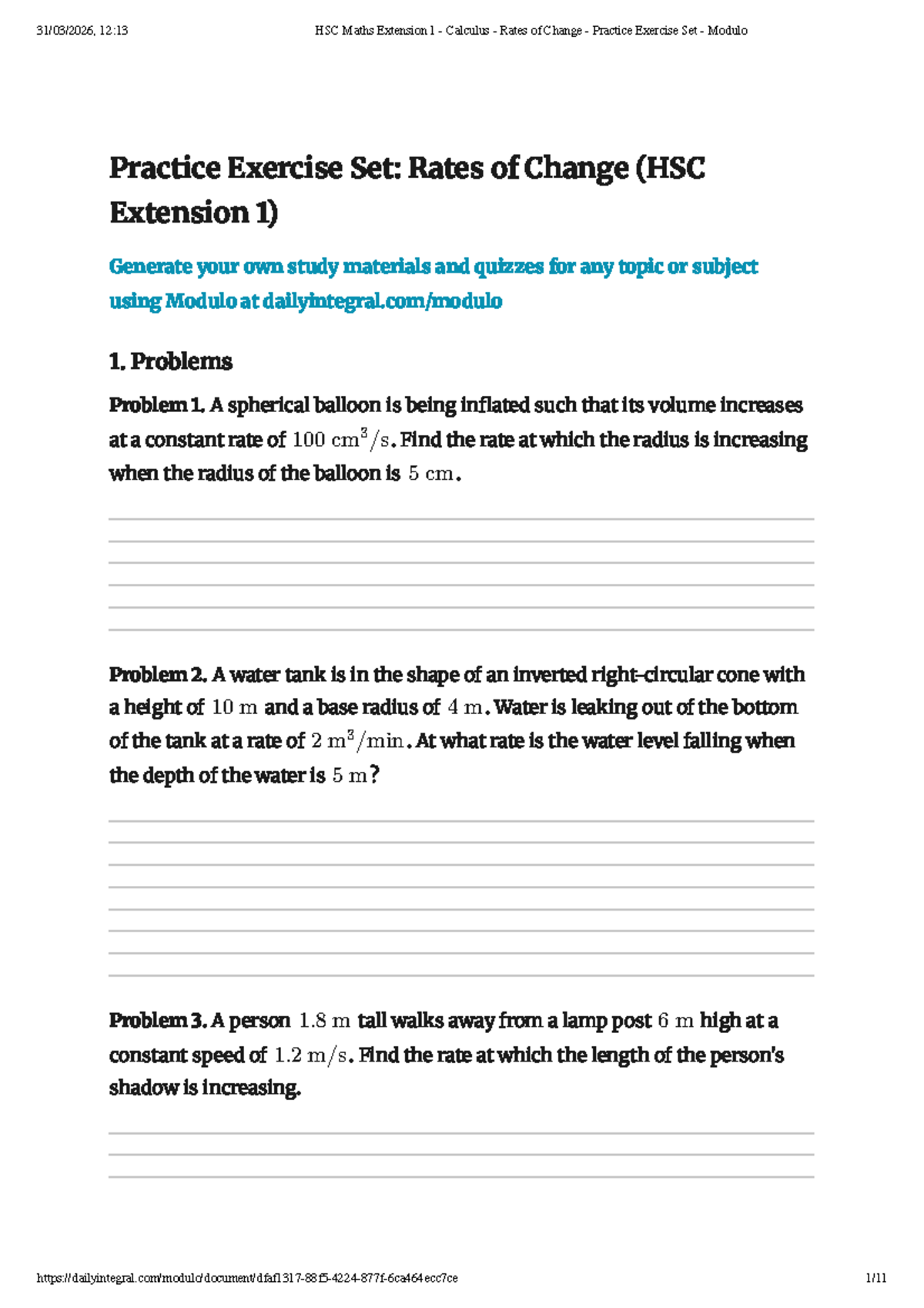 HSC Maths Extension 1: Calculus Rates of Change Practice Set Modulo ...