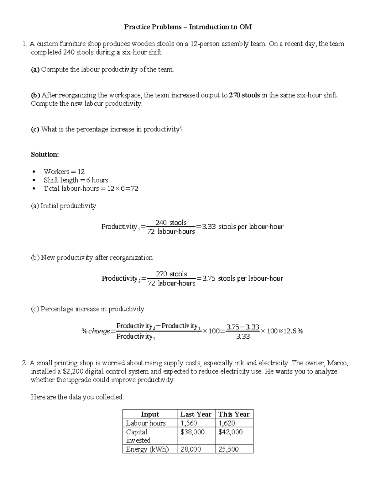 Practice Problems Solutions for OM 1: Productivity Analysis - Studocu