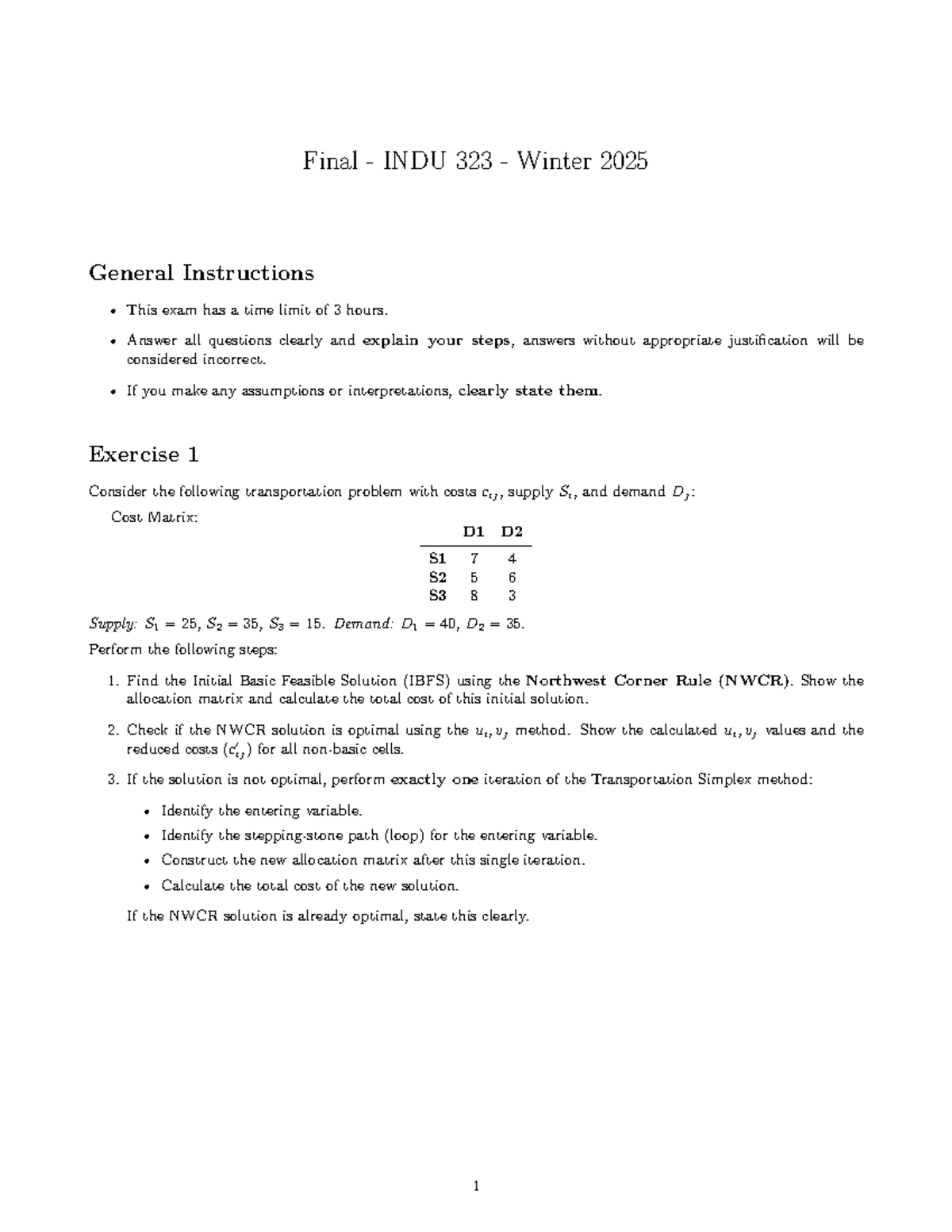 Final Exam INDU 323 Winter 2025: Transportation & LP Problems - Studocu