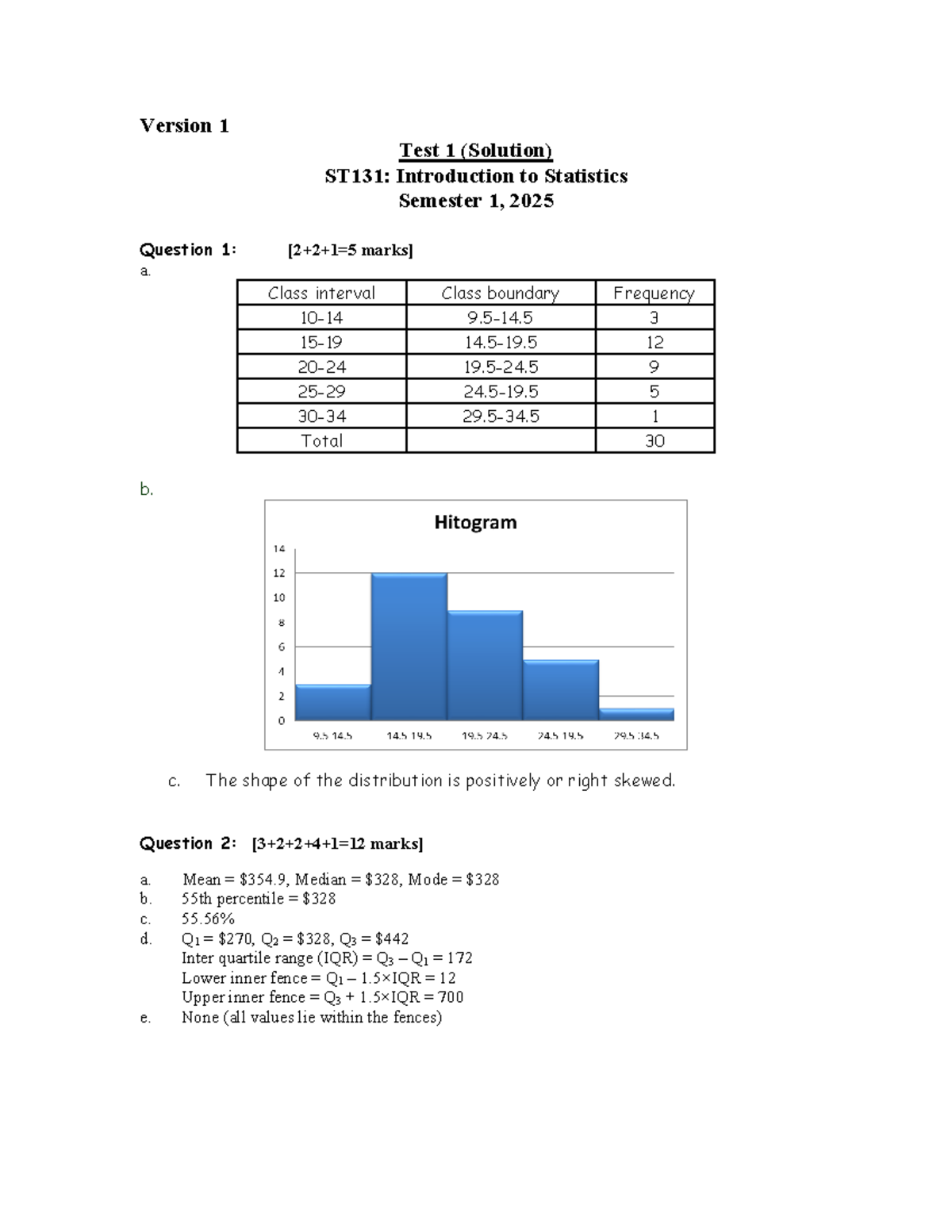 ST131: Test 1 Solutions - Intro to Statistics (Version 1) - Studocu