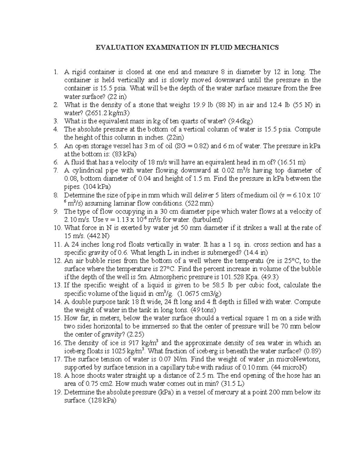 Evaluation Exam in Fluid Mechanics 1 (FM 101) - Studocu