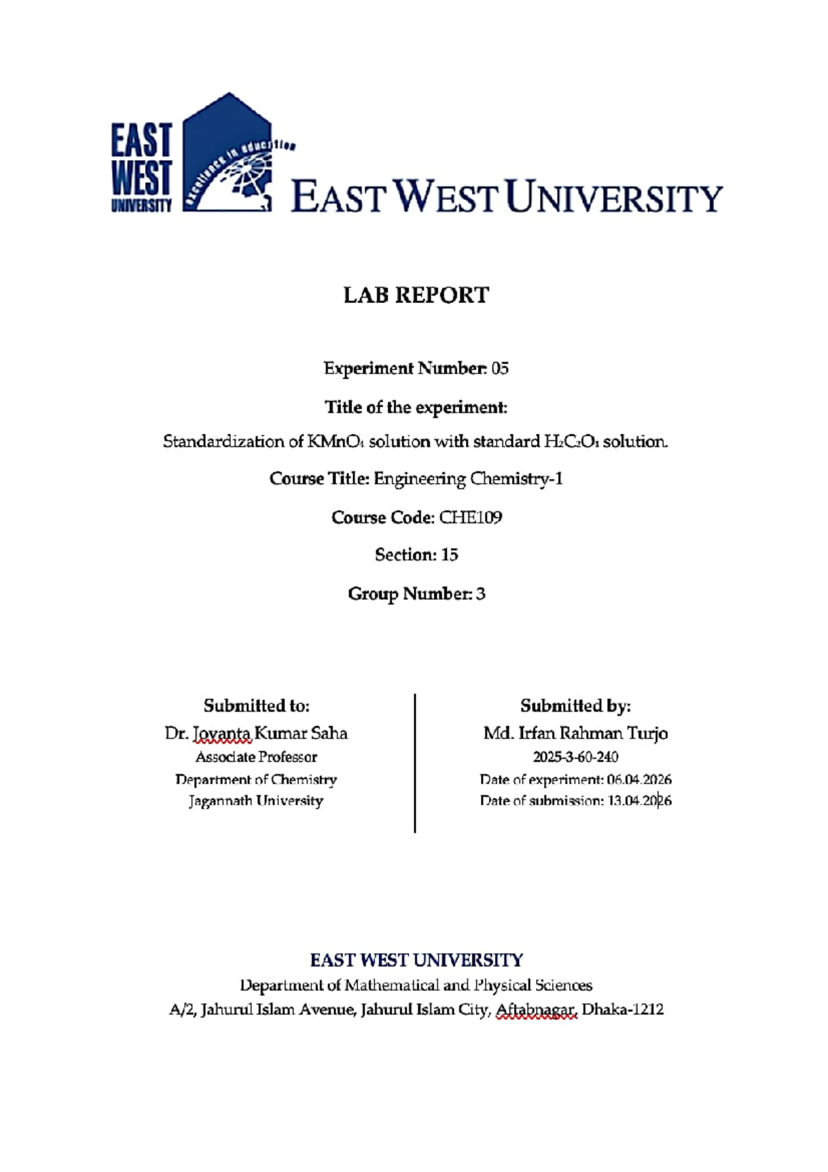 CHE109 Experiment 05 Lab Report: Standardization of KMnO4 Solution ...