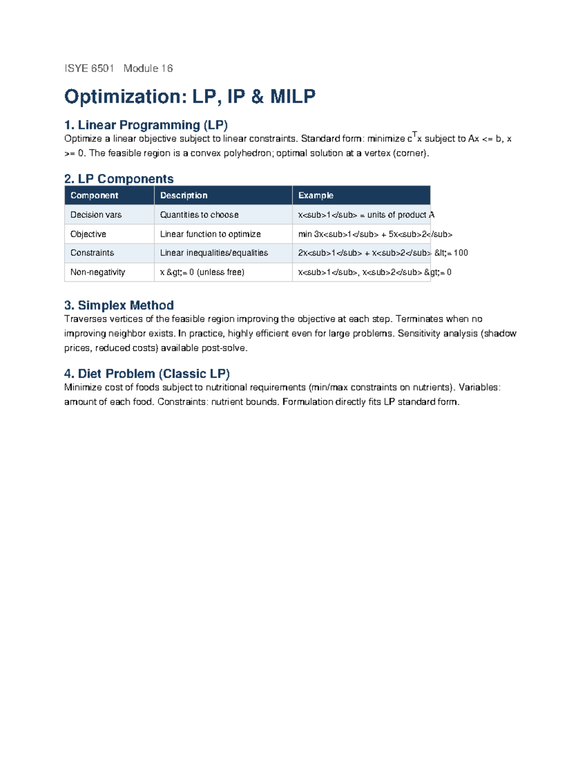 ISYE 6501 Module 16: Optimization Techniques in LP and MILP - Studocu