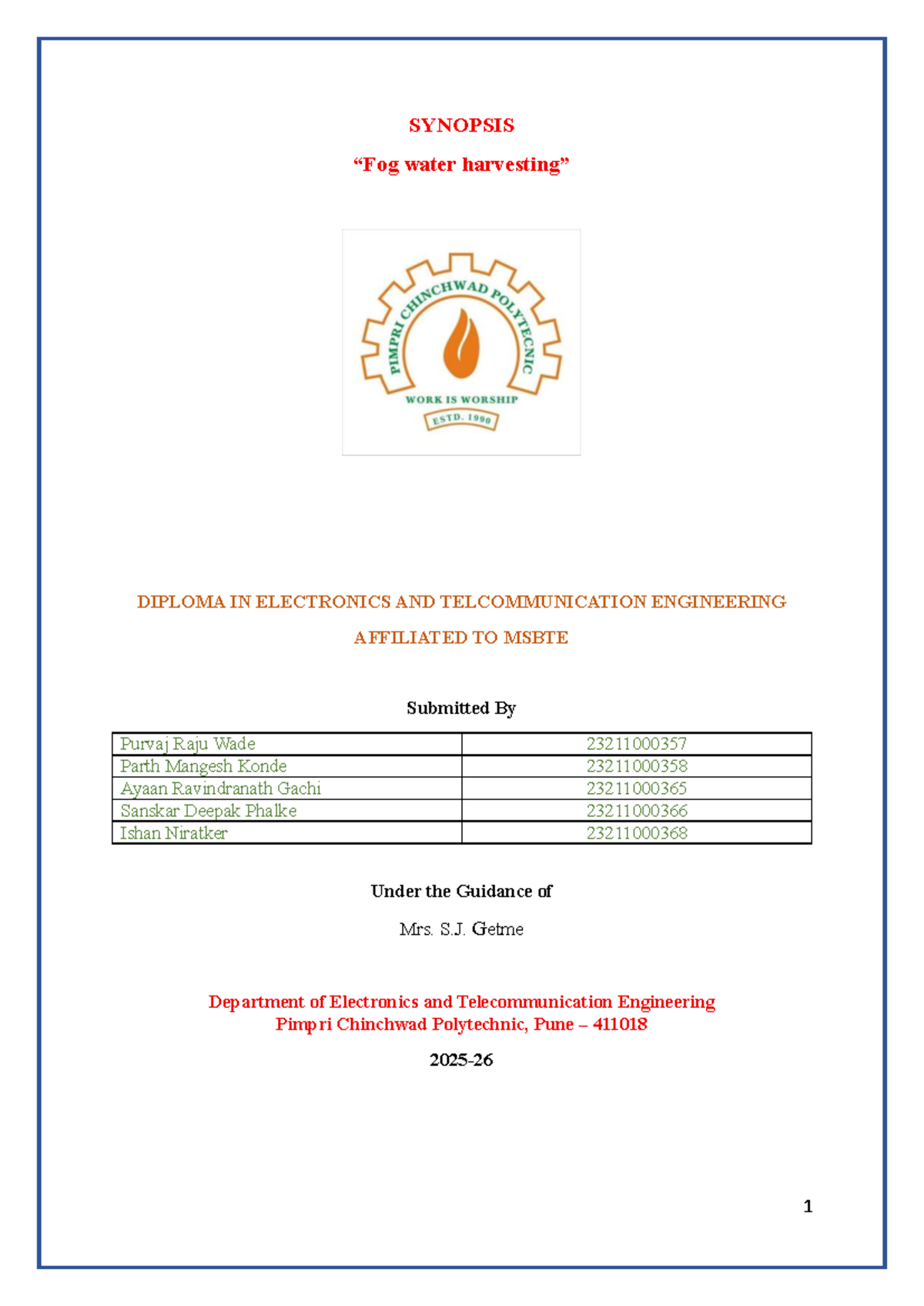 SYNOPSIS: Innovative Electrostatic Fog Water Harvesting System for ...