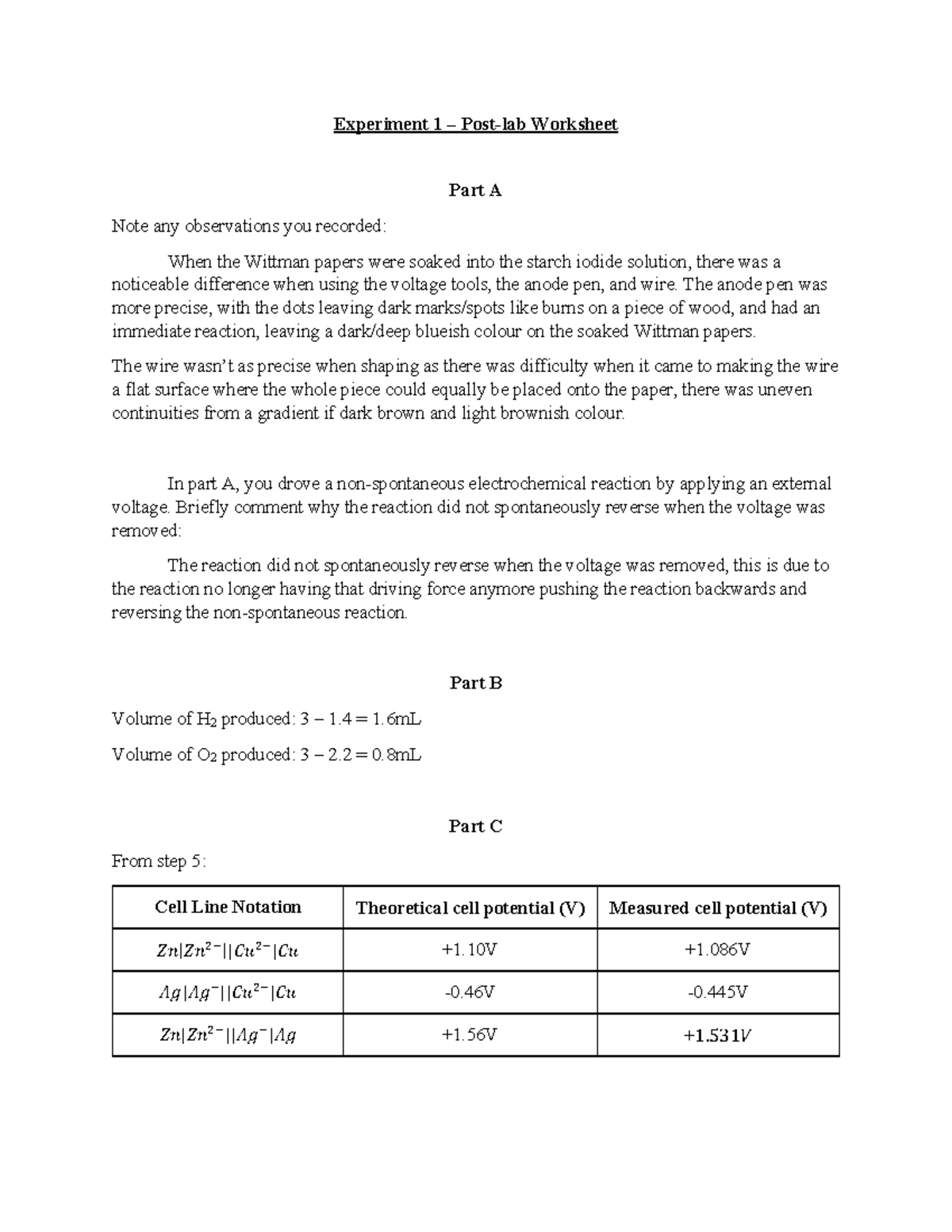 CHM120 - Experiment 1 Worksheet: Observations & Electrochemical ...