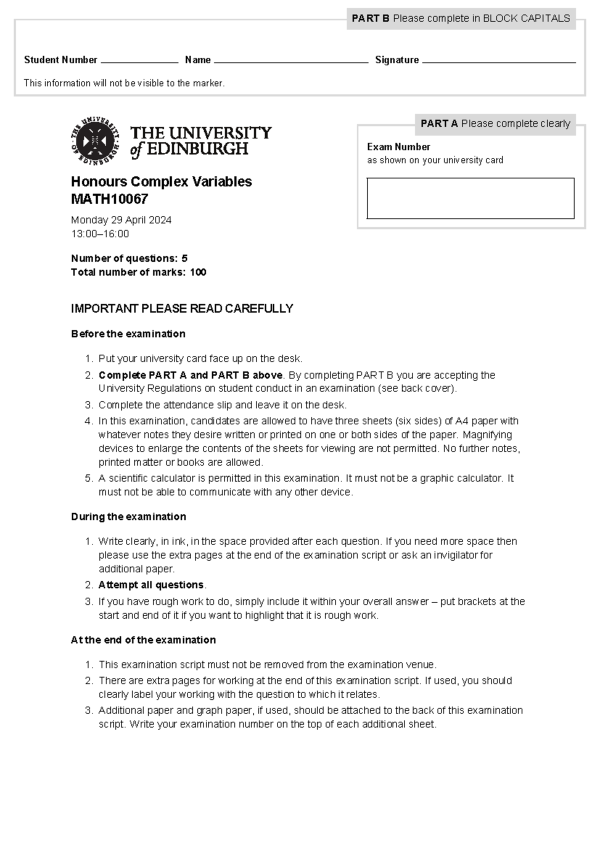 MATH10067 Honours Complex Variables Exam Paper - April 2024 - Studocu