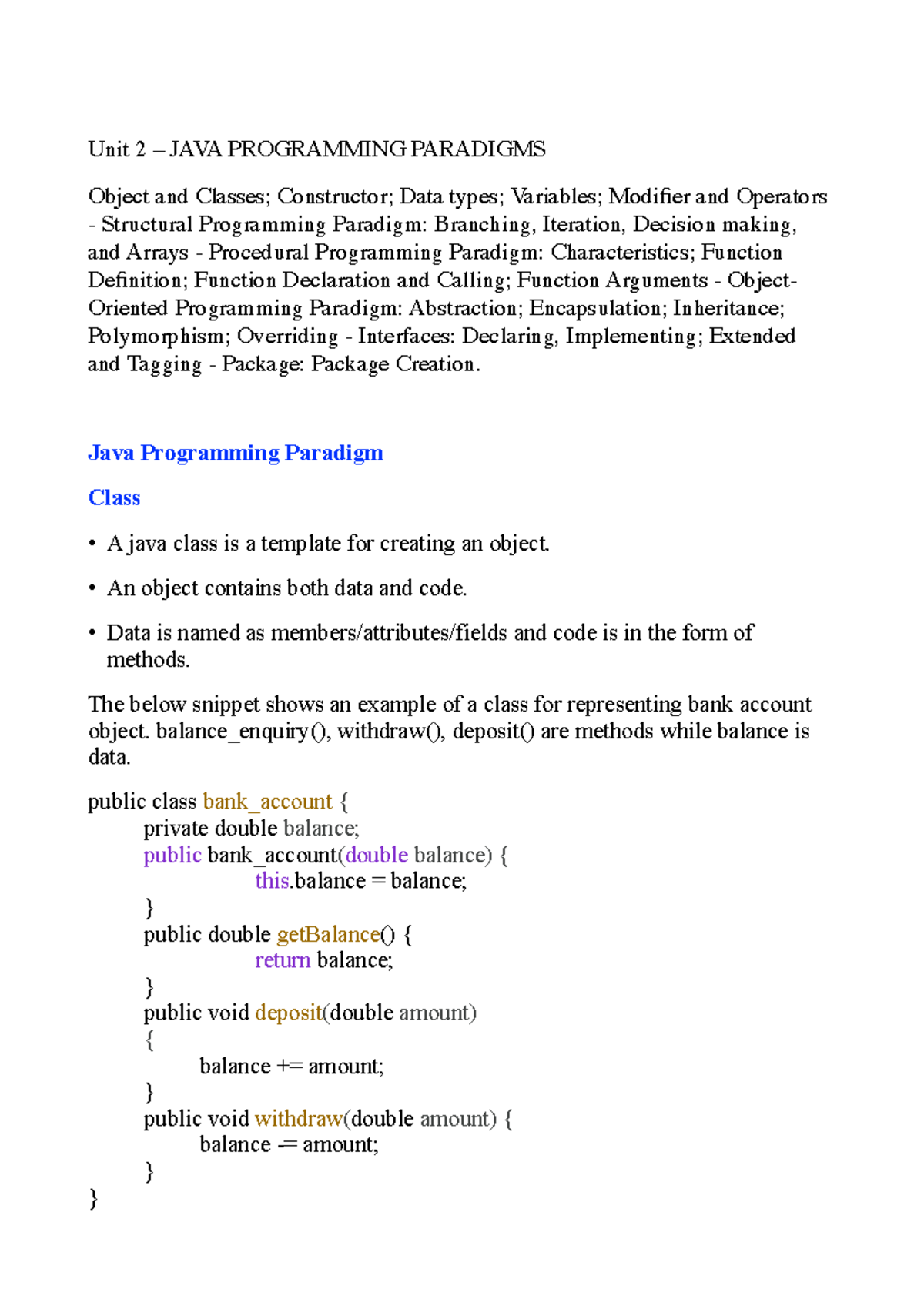APP Unit II - NOTEs - Unit 2 – JAVA PROGRAMMING PARADIGMS Object and ...