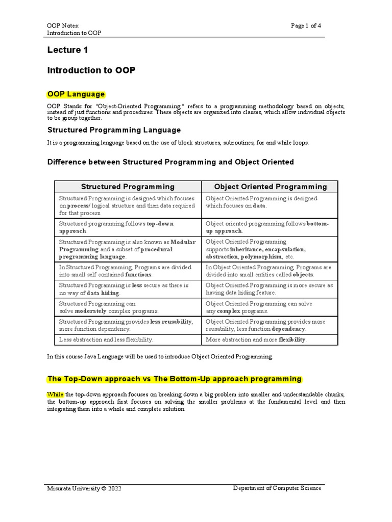 U1 - Basic Concepts of Object Oriented Programming Notes - Studocu