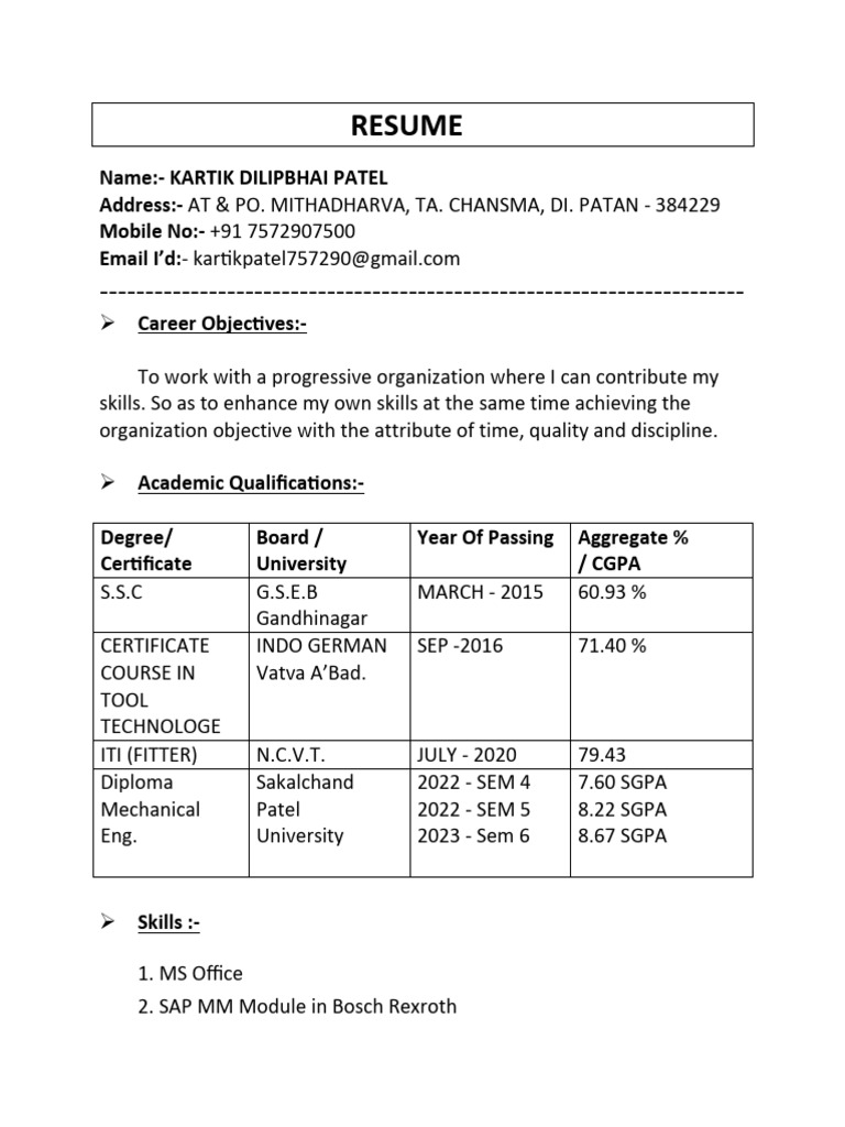 Kartik Patel's Mechanical Engineering Resume | PDF