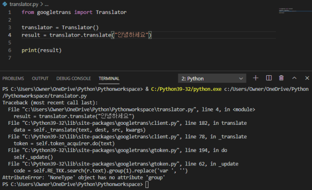 파이썬 googletrans 사용 시 에러 : 네이버 지식iN