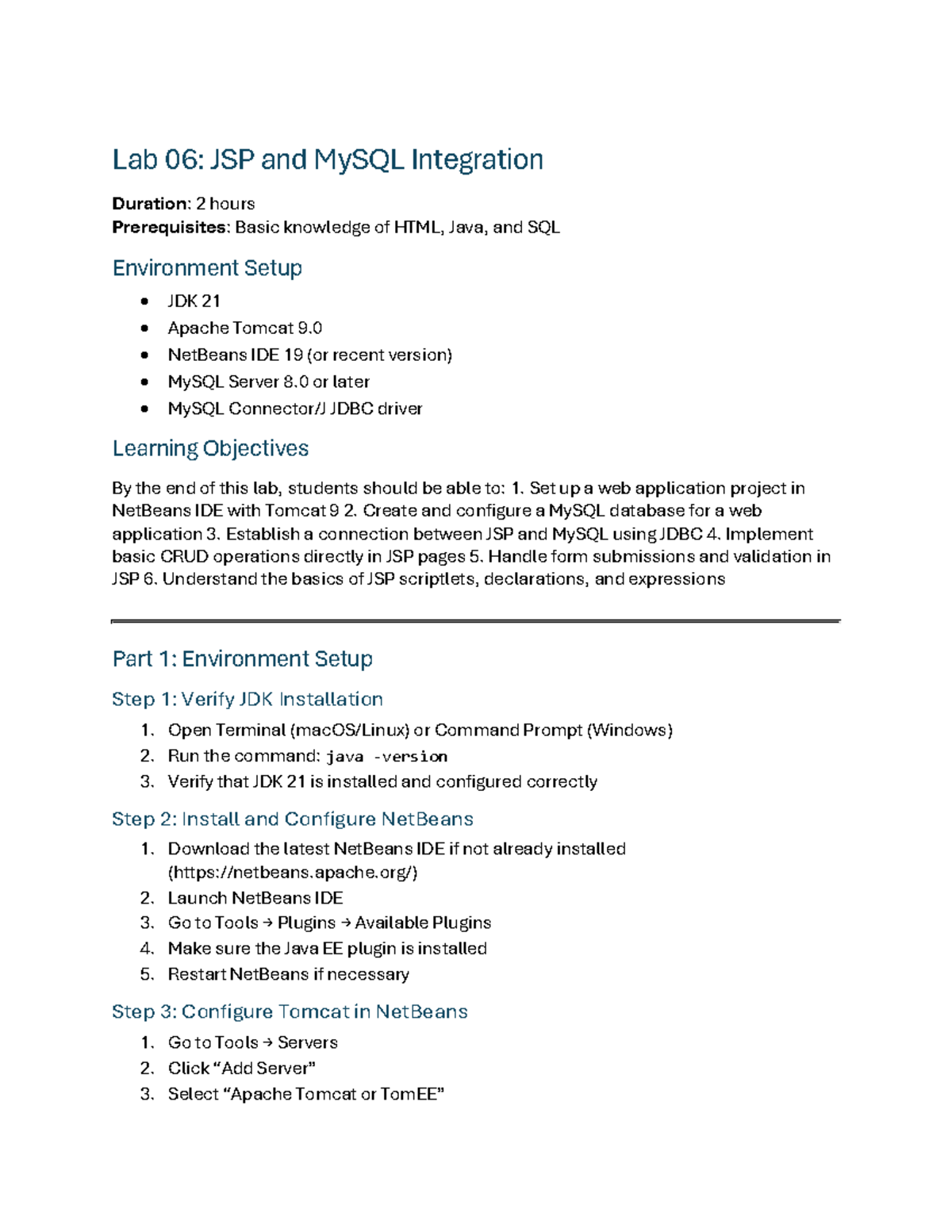 Lab 06: JSP & MySQL Integration - Setup & CRUD Operations Guide - Studocu