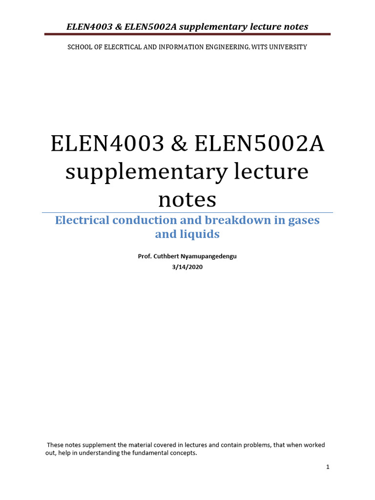 ELEN4003 Notes-Conduction and Breakdown in Gases & Liquids | PDF ...