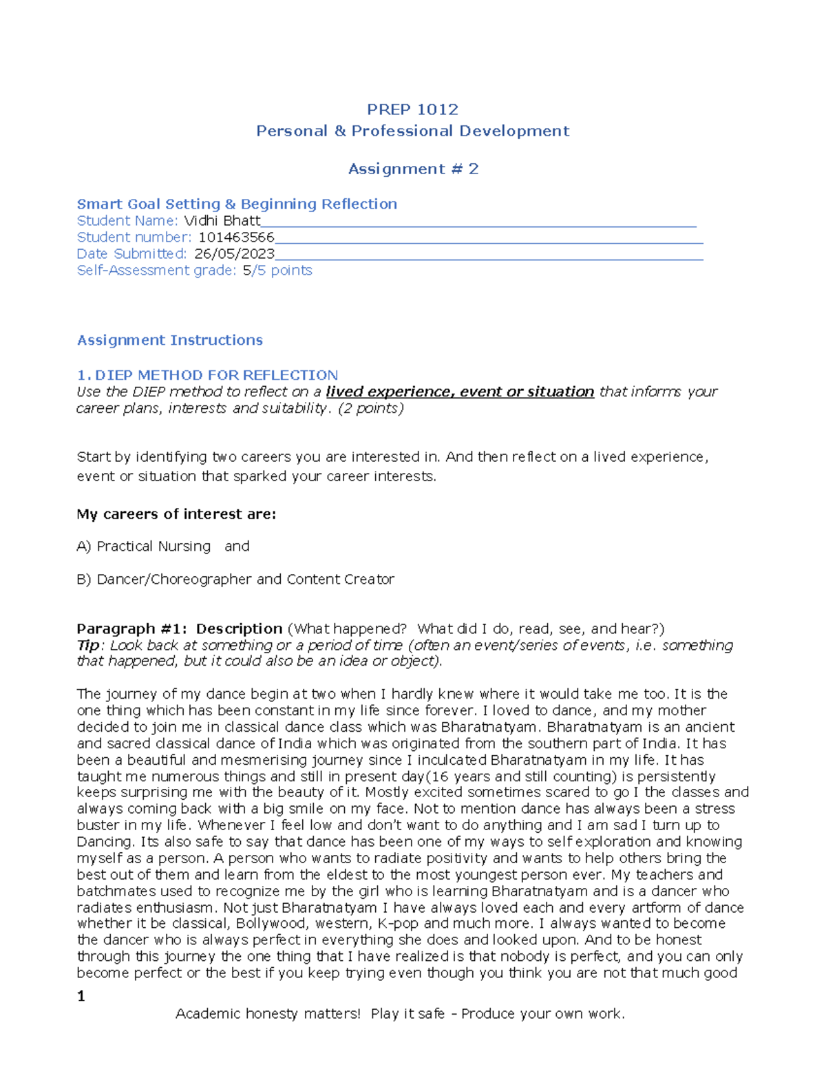 Assignment 2 - Reflection & Goal Setting - 2022 - PREP 1012 Personal ...