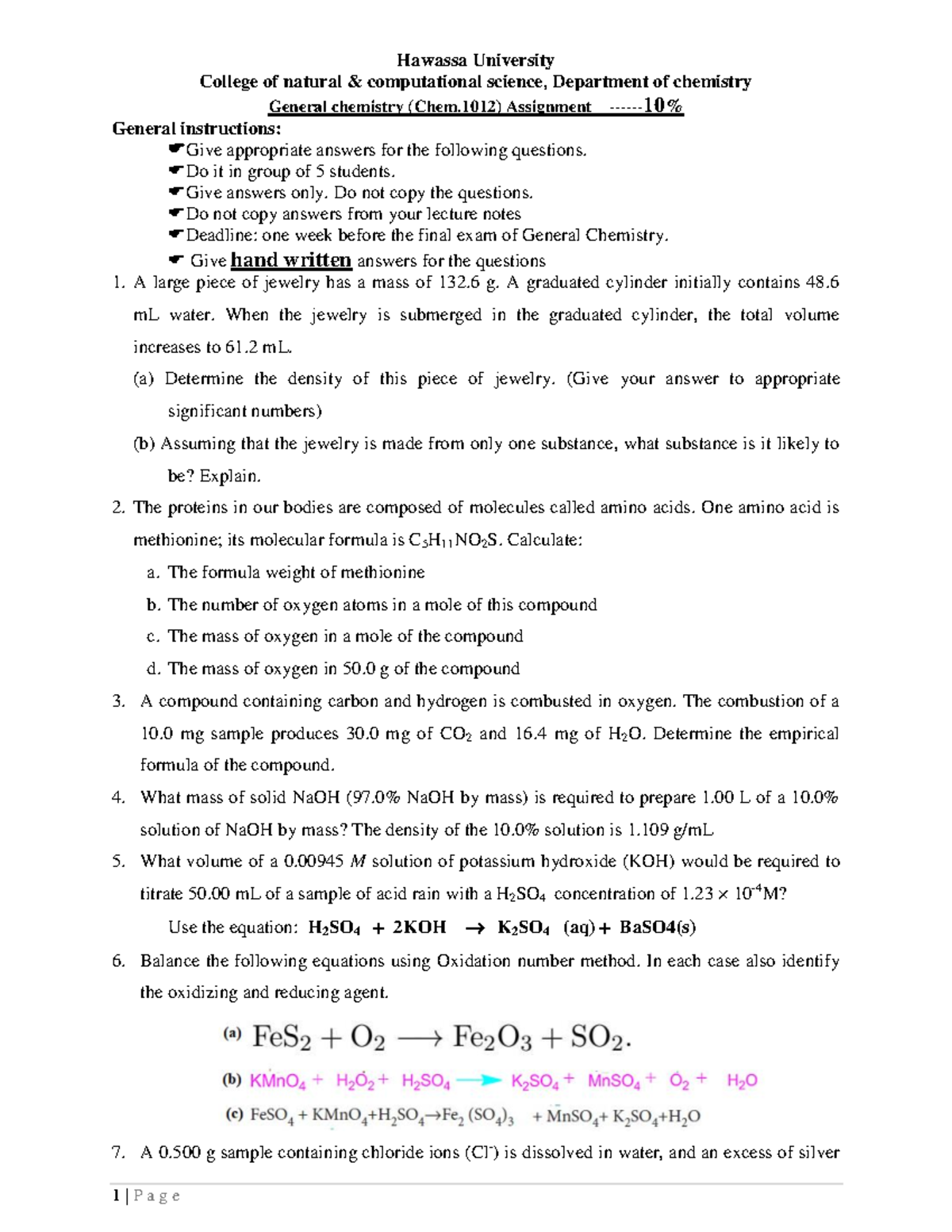 Gen Chem (Chem.1012) Assignment Questions for Final Exam Preparation ...