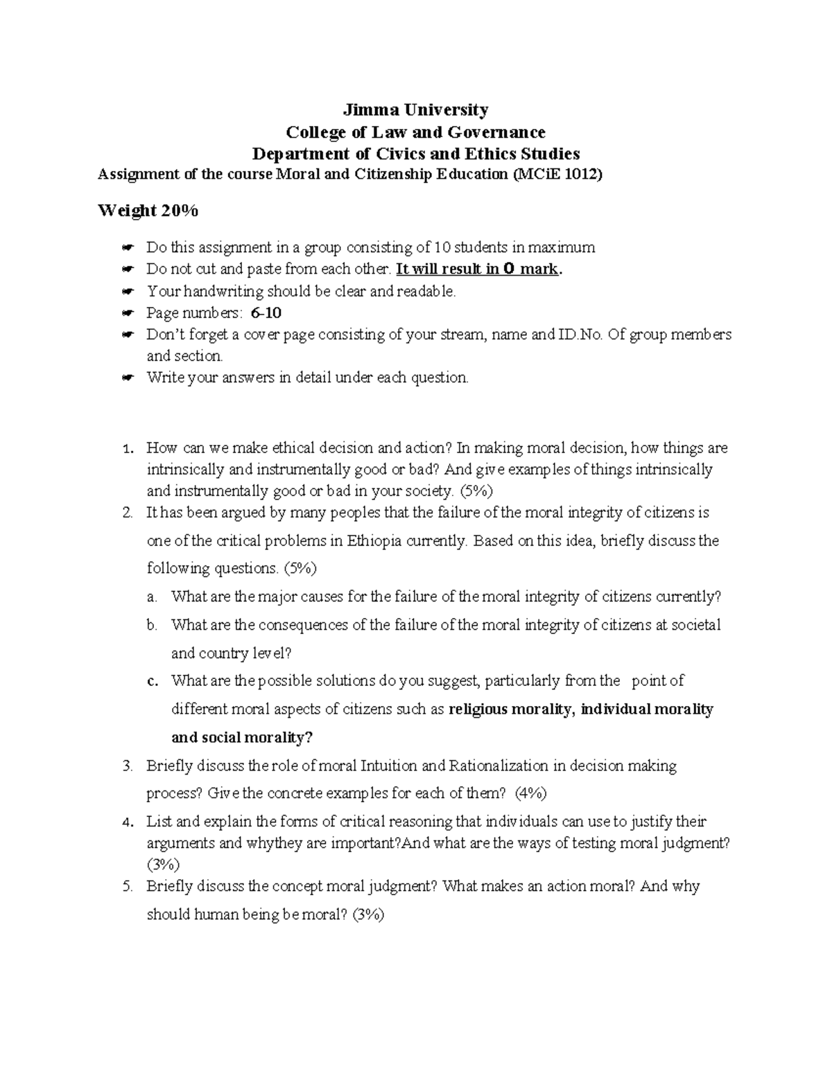 MCiE 1012 Assignment: Civic and Moral Education Insights - Studocu