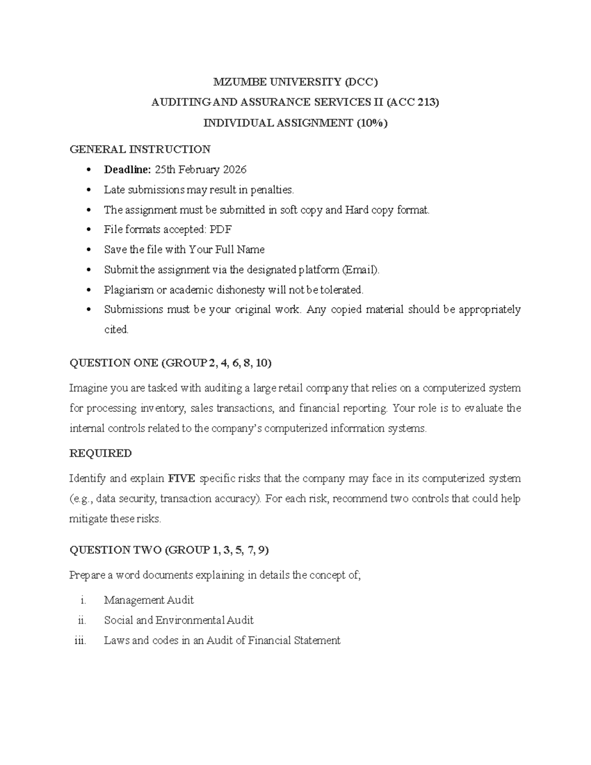 ACC 213 Individual Assignment: Auditing Risks & Controls Analysis - Studocu