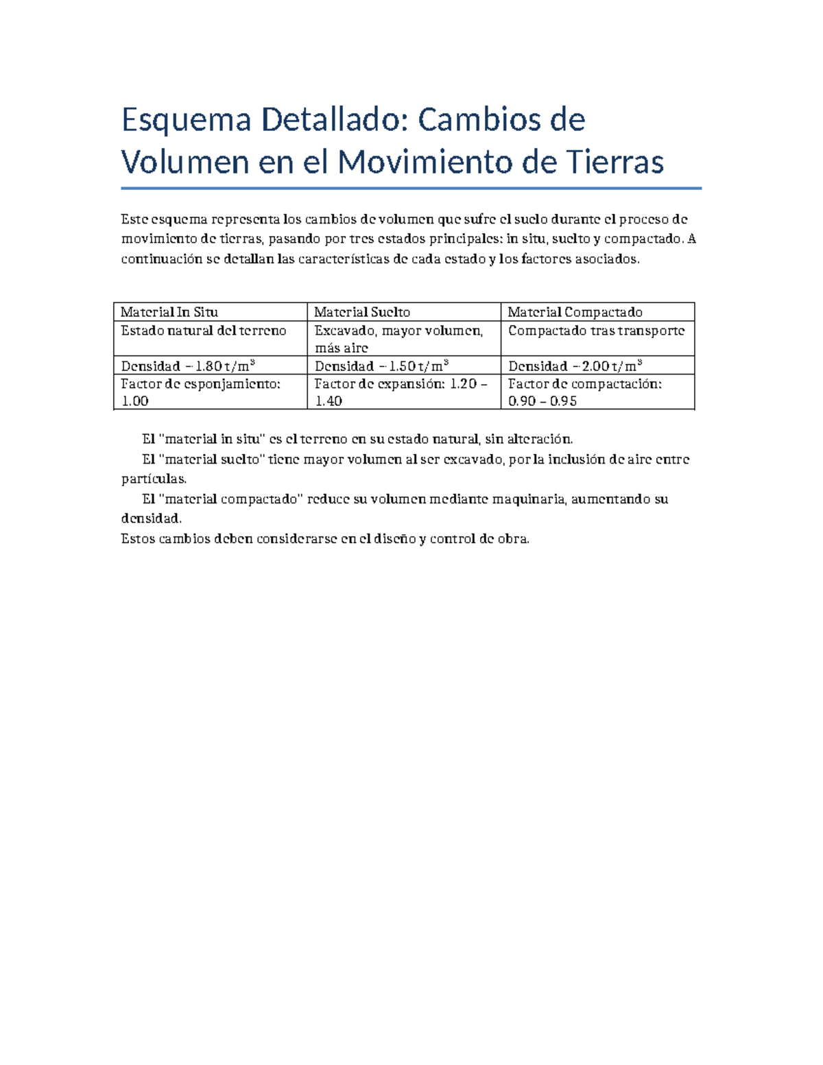 Esquema Detallado: Cambios de Volumen en Movimiento de Tierras - Studocu