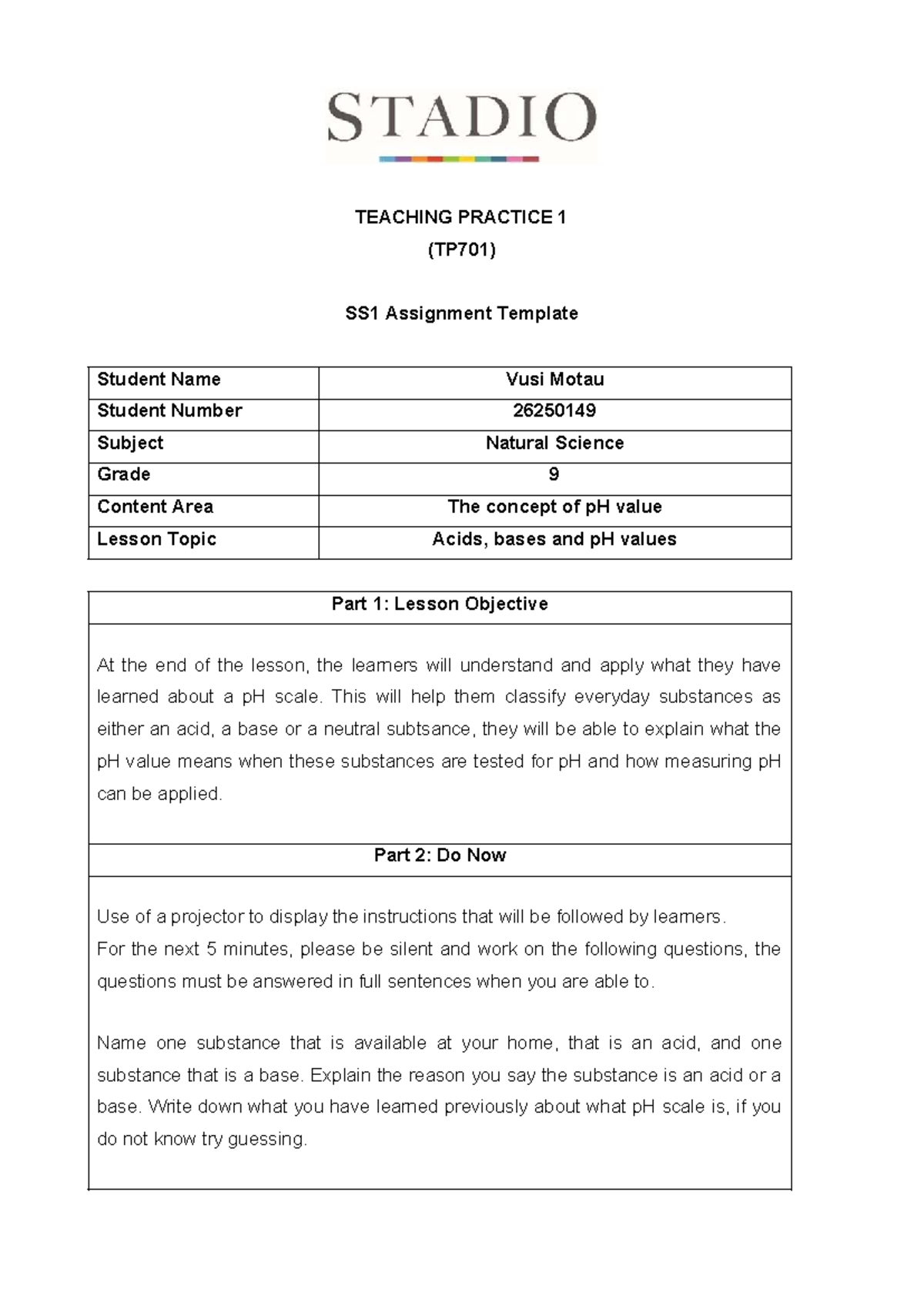 TP701 SS1 Lesson Plan: Understanding pH, Acids, and Bases - Studocu