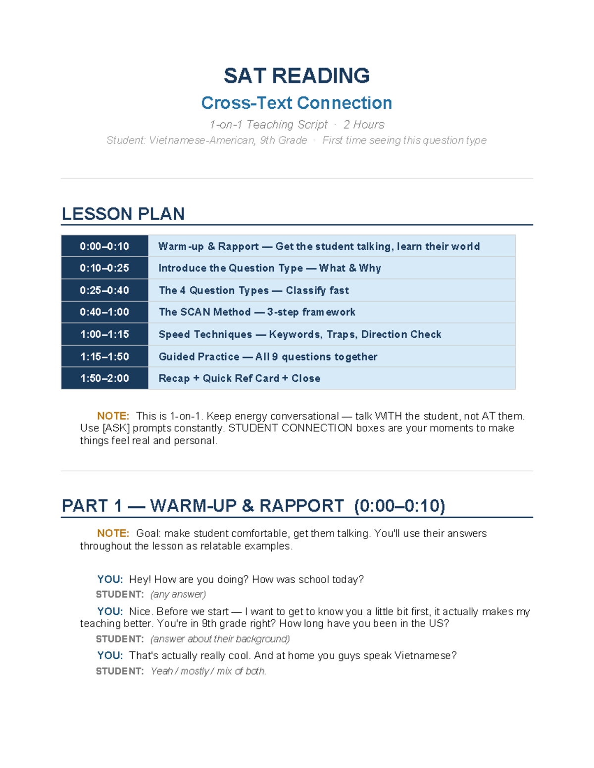 SAT READING Connection Teaching Script: 9th Grade Lesson Plan - Studocu