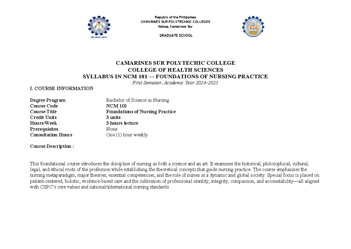 NCM 101 Foundations of Nursing Practice I: Syllabus & Teaching Plan ...