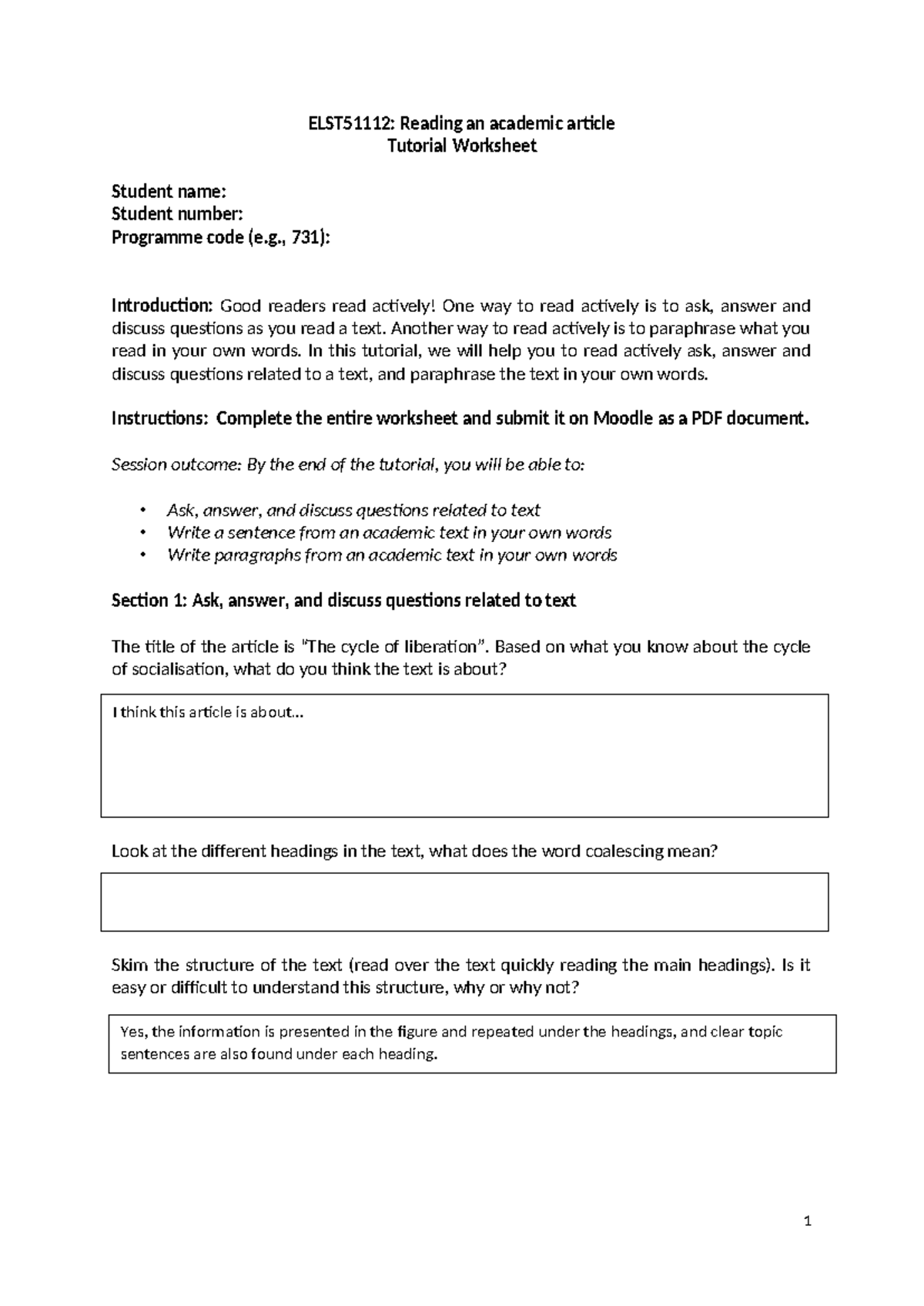 Reading an Academic Article Tutorial Worksheet (Course Code: 731) - Studocu