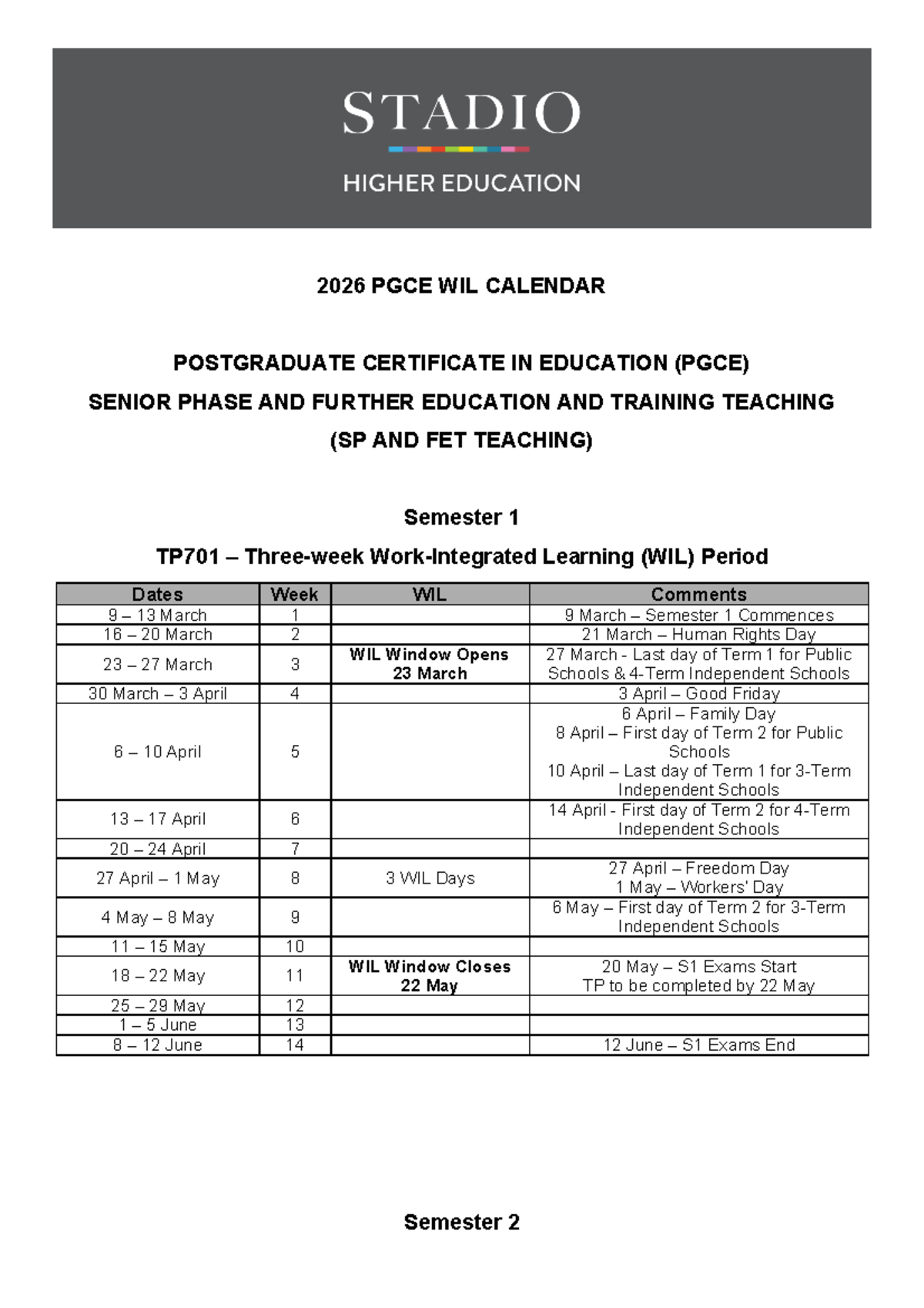 2026 PGCE TP701 WIL Calendar for Semester 1 Teaching Period - Studocu