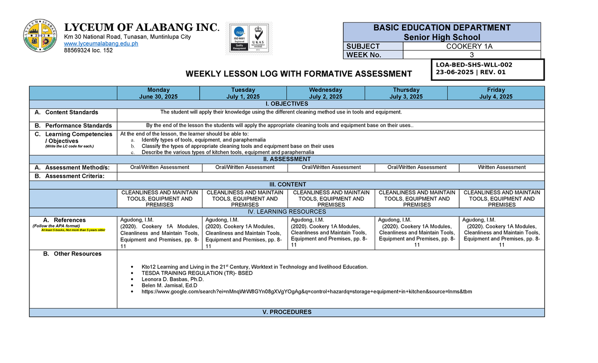 WLL WEEK 3: COOKERY 1A FORMATIVE ASSESSMENT LOG (JUNE 30-JULY 4) - Studocu