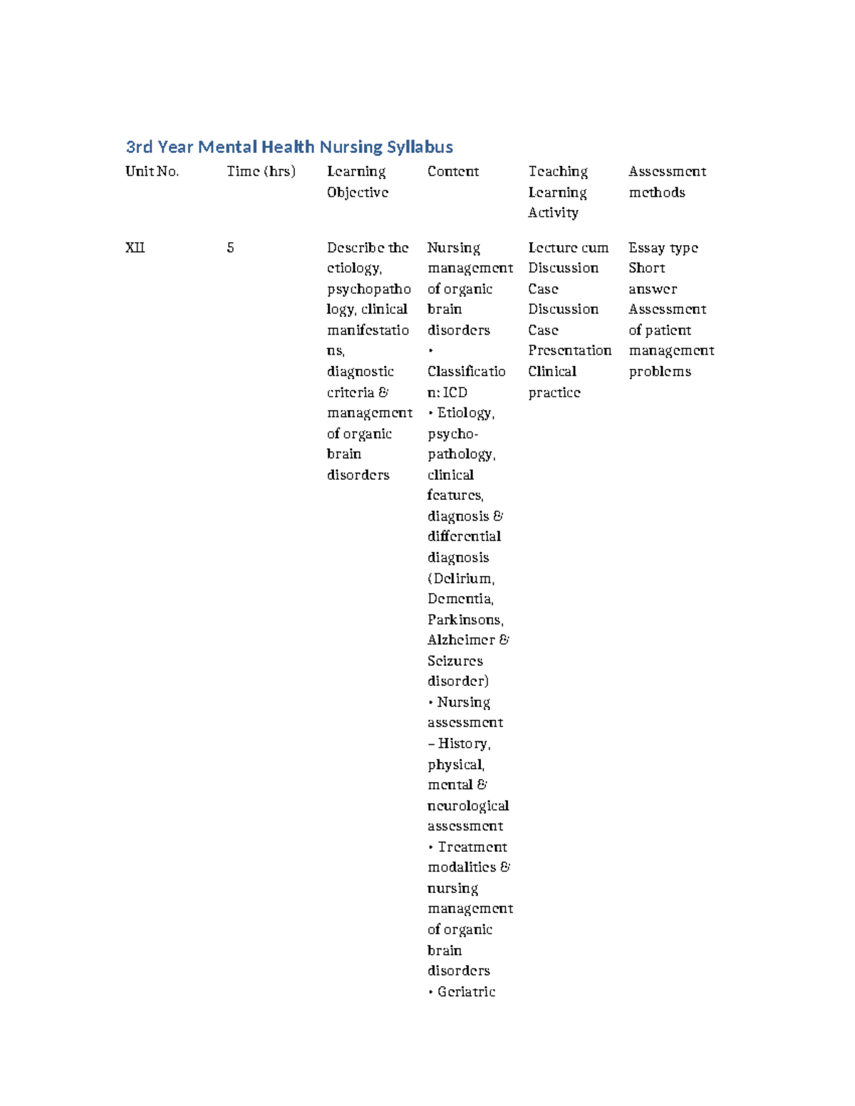 3rd Year Mental Health Nursing Syllabus: Organic Brain Disorders ...