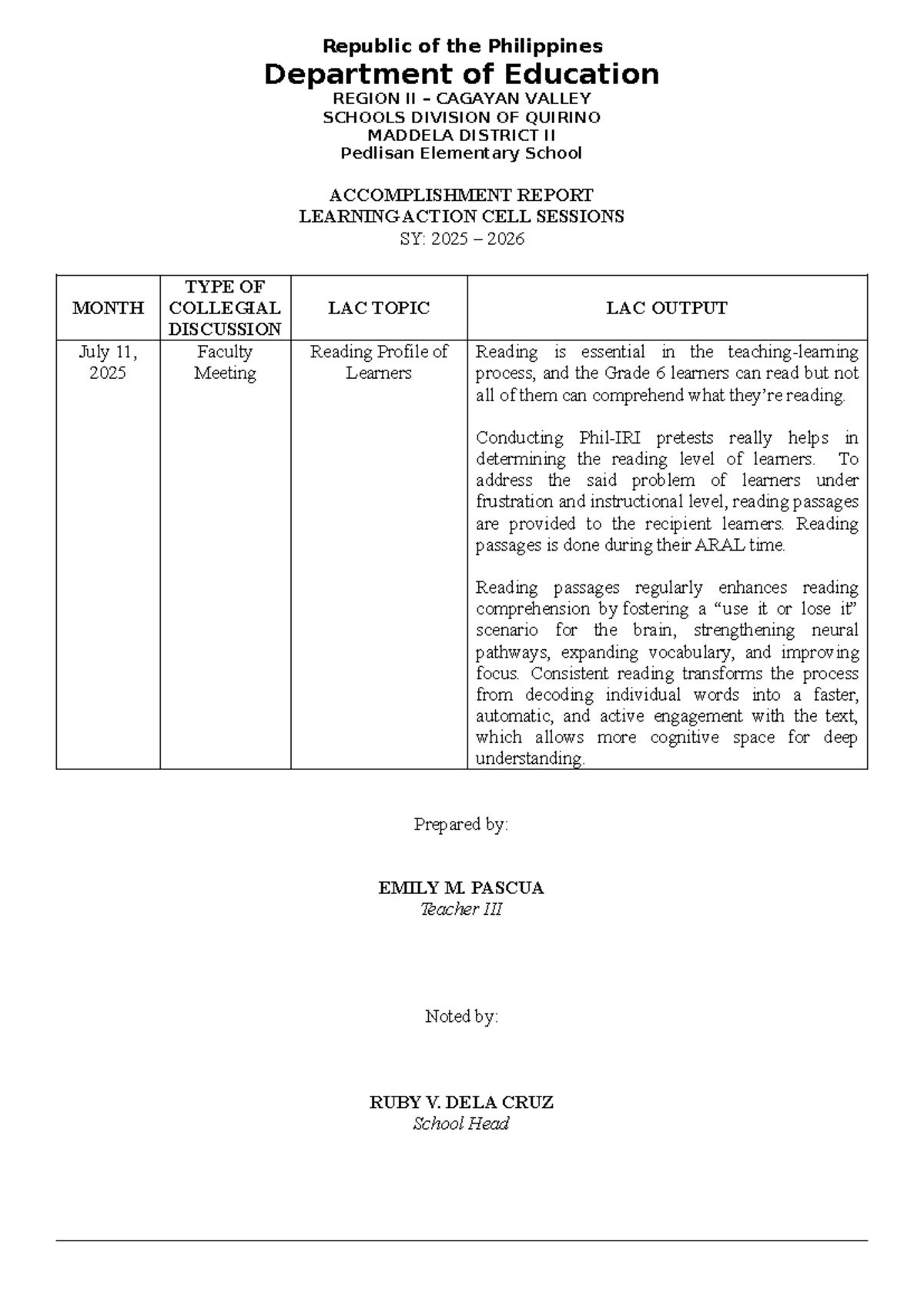 Accomplishment Report: Learning Action Cell Sessions SY 2025-2026 - Studocu