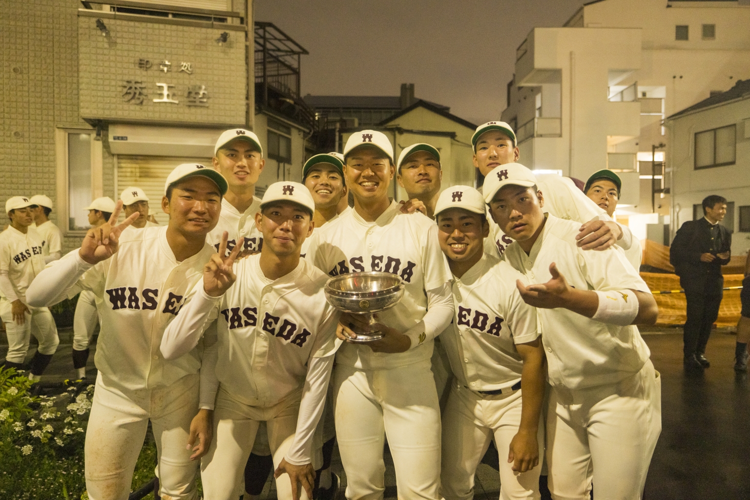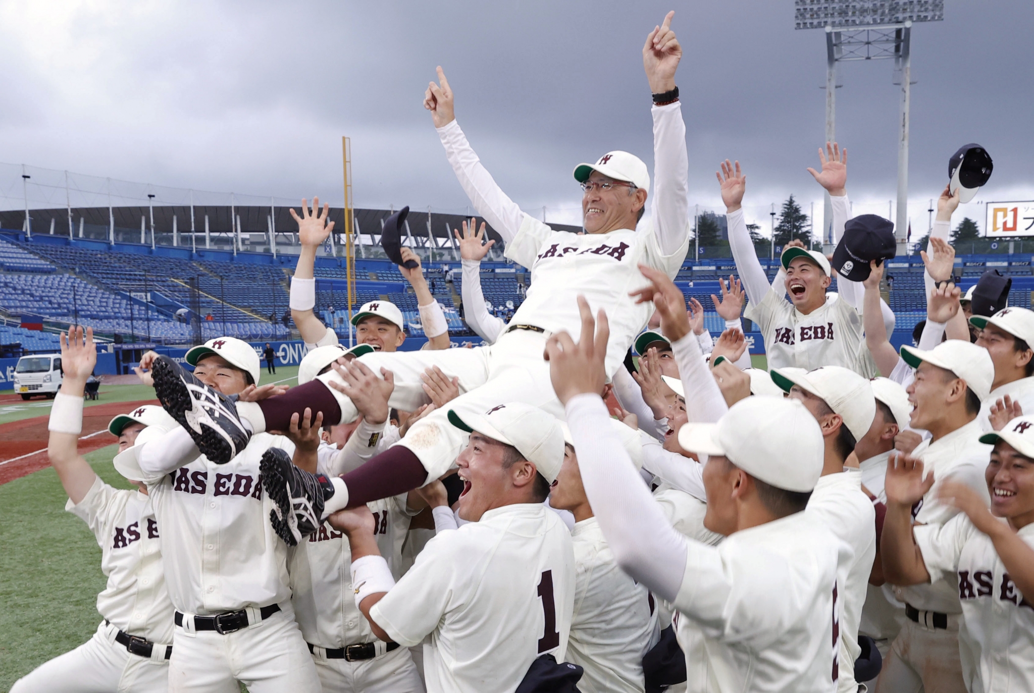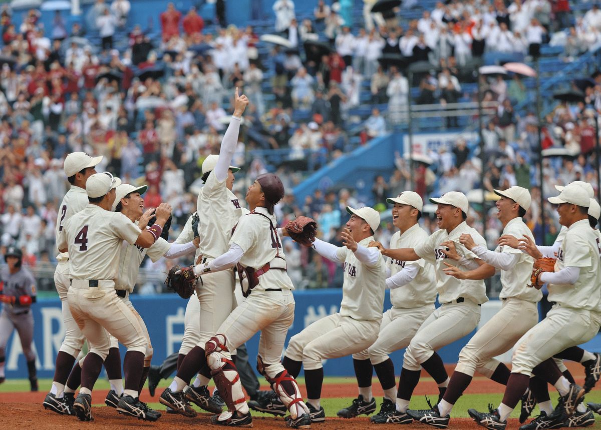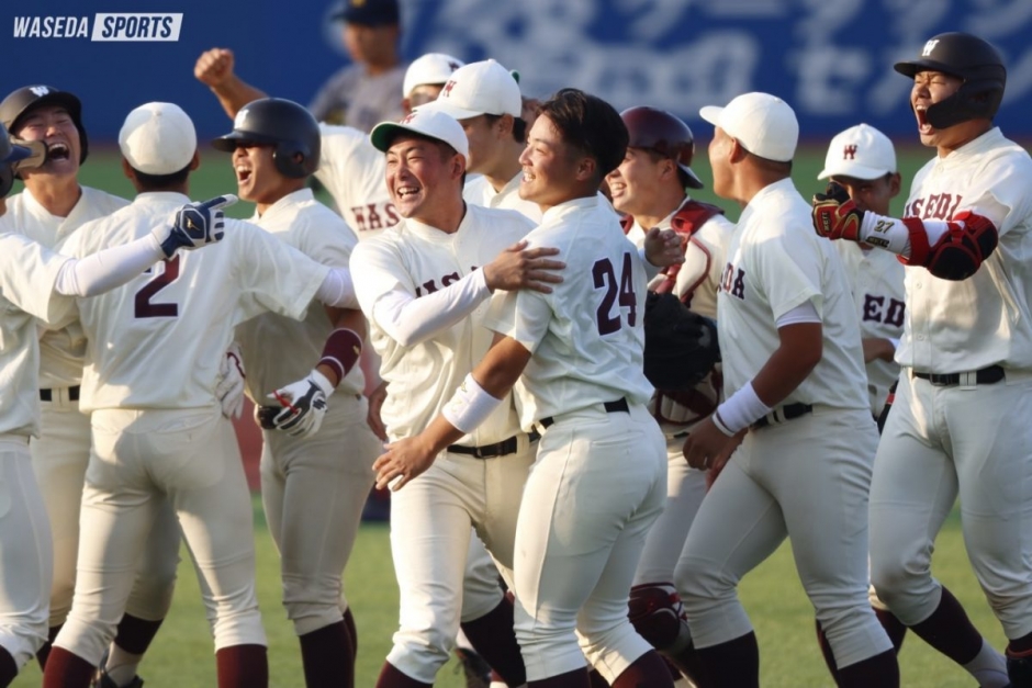 Based on this image's title: “早大野球部「怒涛の5連勝」で3連覇 春季リーグ戦、優勝決定戦で明大破る - スポーツナビ”