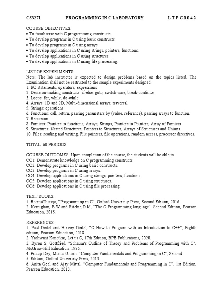Programming in C Laboratory - CS3271 - Lab Manual | PDF | Computer ...