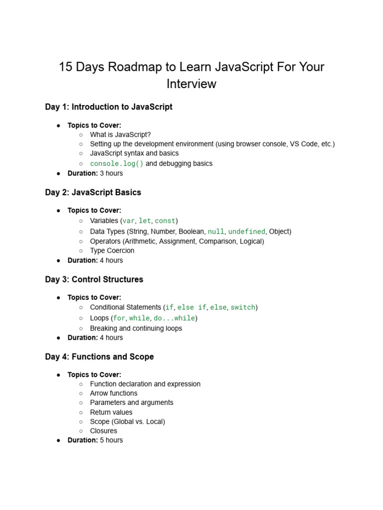 Based on this image's title: “15 Days Roadmap To Learn JavaScript For Your Interview | PDF ...”
