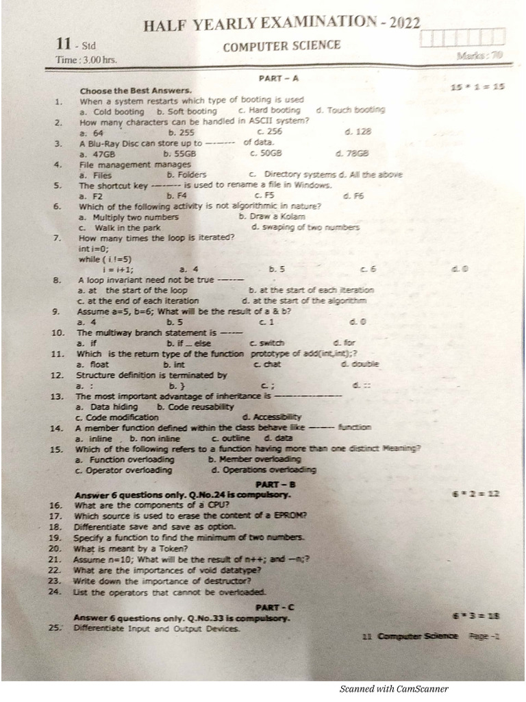 half-yearly exam sample paper computer science class 11 best ...
